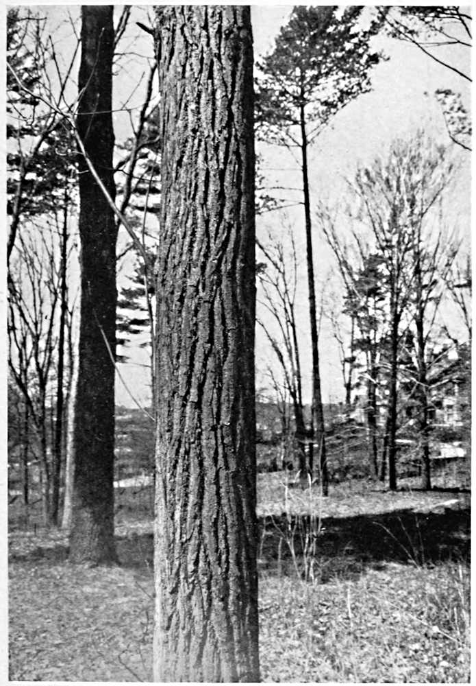 A large tree, 50 to 80 feet high, with thick, rough bark and lithe branches. The twigs are smooth and often yellow in color, and the small alternate leaf-scars have three bundle-scars. The buds are pointed, covered with a single scale and placed close against the stems. The lateral buds are numerous and are usually larger than the terminal buds.