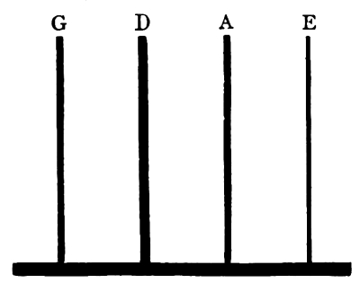 [7] To ensure equality of tone it is very important that the strings should be correctly guaged with regard to their relative thicknesses. If all the strings are too thick, the instrument will speak with difficulty in delicate passages, demanding a heavier pressure of the bow; if too thin, loss of power will be the result, though with a corresponding gain in sweetness and clearness, and if one string be much out of proportion to the others, the first finger when placed properly on that string and the adjacent one will not yield a perfect fifth, besides the inequality in power. The following diagram shows a set of strings of medium thickness, together with the distances apart near the bridge on a full sized violin, as suitable for ordinary hands. For fingers that taper much towards the tips, or for those that are very broad, the distances may be made a little narrower or wider accordingly. First strings of silk, known as “Acribelles” are in great demand by players with perspiring hands, as they are less affected by moisture than gut, but the tone is not so good. They possess certain advantages in durability, and standing well in tune, but are more difficult to tune, as a very slight movement of the peg will send them up half a tone. When frayed, they should be removed, the quality of tone they then yield being very bad, affecting the other strings. If gut strings of good quality are bought, and the strings carefully looked at before playing, breakages at awkward moments will seldom occur, as the strands generally give warning before breaking by showing symptoms of unravelling, especially at the knot end, or under the bow,—when they should at once be replaced. Tr.