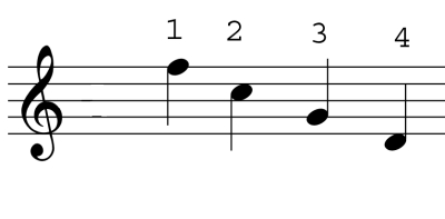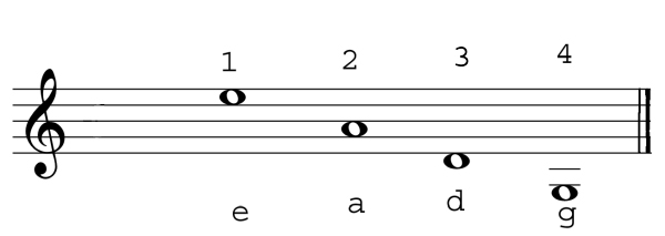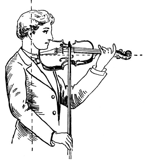 [11] The A may be taken from a pitch pipe, tuning fork, or piano, which should be maintained at concert pitch. In old violins, if the belly has yielded to pressure under the right foot of the bridge, it is well after playing to let down the first string. If a string is too flat, pull it up about a tone above the proper pitch, let it so remain for a few seconds and then lower it to the correct pitch. If too sharp, reverse the process. Only the A must be taken from a keyboard instrument, the fifths on the keyboard being not quite perfect, but “tempered”. Perfect fifths can only be obtained by a good deal of practice. Advanced students may test the tuning quietly by taking any two adjacent strings (with the little finger equally on both) in harmonics, or by beating lightly with the stick on the string. In the course of a piece, if even this is not possible, a slight pressure above the nut will sharpen a string, tugging it between nut and bridge will flatten; but this must only be regarded as a temporary expedient. Tr.