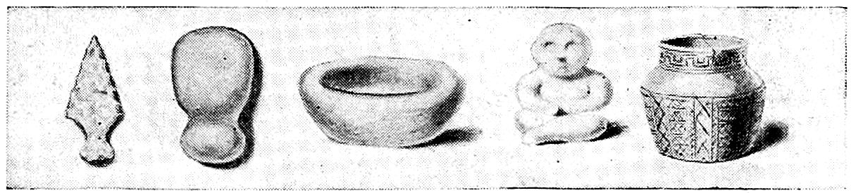 Looking back over the centuries we see a period many thousands of years ago when primitive man lived in caves or other rude habitations and was entirely without the implements which we now consider indispensable. The weapons with which he defended his wife and babes from the wild beasts and from his warlike neighbors were clubs, wooden spears with perhaps a bone or shell tip, and hatchets of chipped stone tied with thongs of hide into a split stick. He managed by ingenious snares and his crude weapons to provide game and fish for the support of his family.