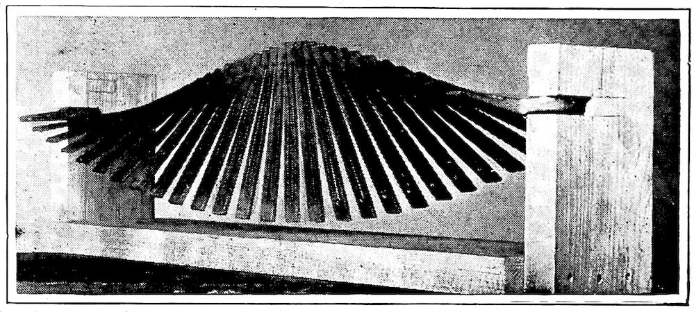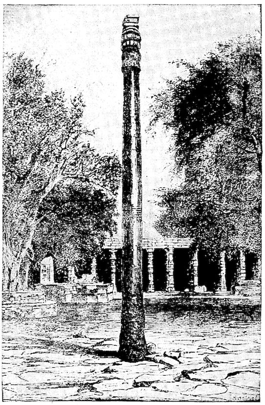 The much discussed pillar at Delhi, India, which is still standing in a remarkable state of preservation, is twenty-two feet high. It is made up of several wrought iron sections cleverly welded together. As the natives regard it with religious awe, metallurgists have been unable to make thorough investigation and chemical analysis. While the date of its erection is somewhat in doubt, it is supposed to have been about the 4th or 5th century A.D.