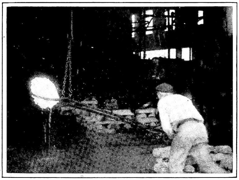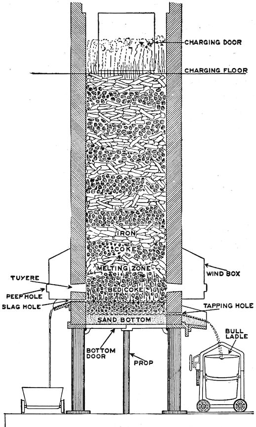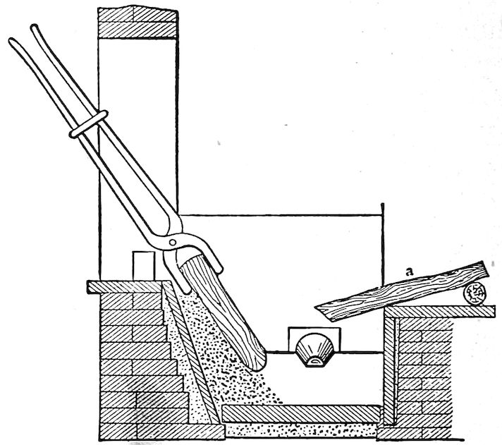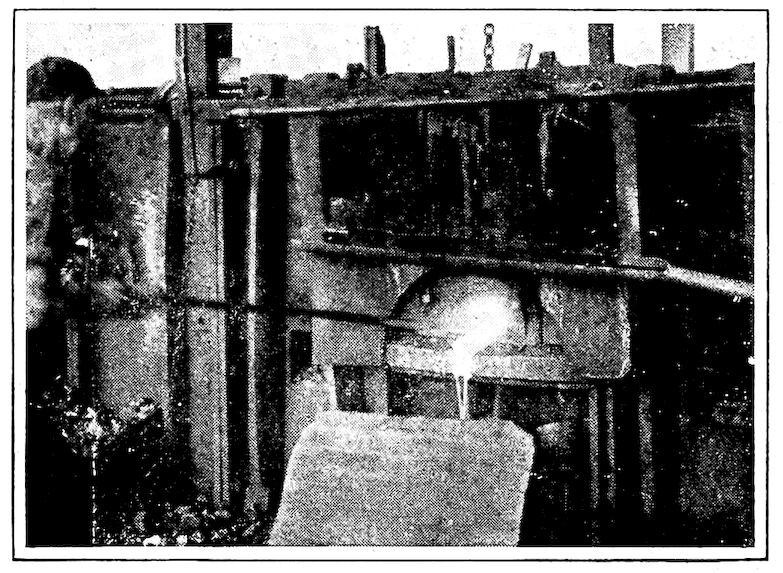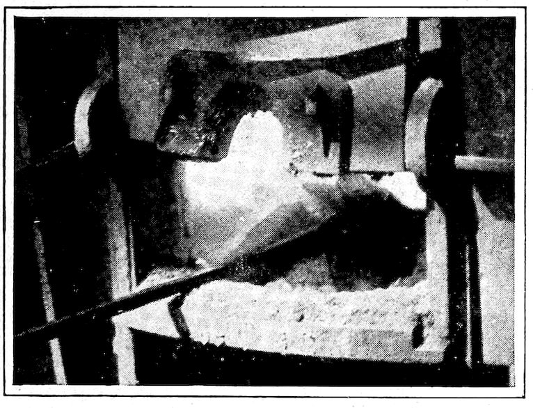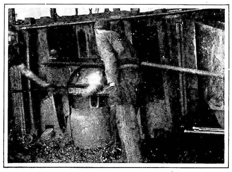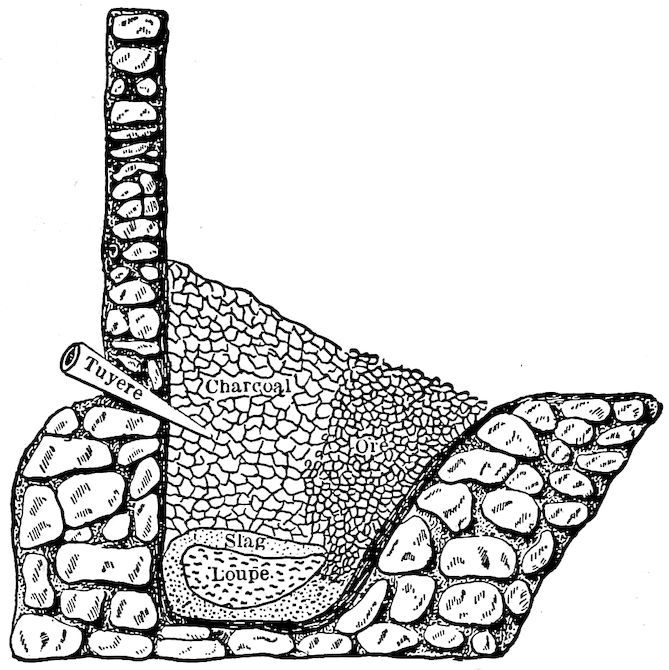 To state the matter in a simple way, iron ore, which is essentially a natural “iron rust,” is the metal, iron, held in the strong chemical grip of the gas, oxygen, which normally forms one-fifth of the air we breathe. As you note, the combination forms a substance 7entirely unlike either the iron or the oxygen, but both of these can be regenerated from it (the ore) by chemical methods. Under influence of high heat (this is one of the chemical methods, by the way), this stranglehold can be broken by carbon, of which lampblack, graphite, charcoal, and coke, are our most familiar examples. The result, in the small, crude, and inefficient furnaces of long ago was a disappointingly small ball of crude iron, pasty and scarcely meltable, even at highest heats, but soft and malleable when cold. As mentioned, it was a variety of what is now commonly called “wrought iron.”