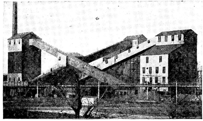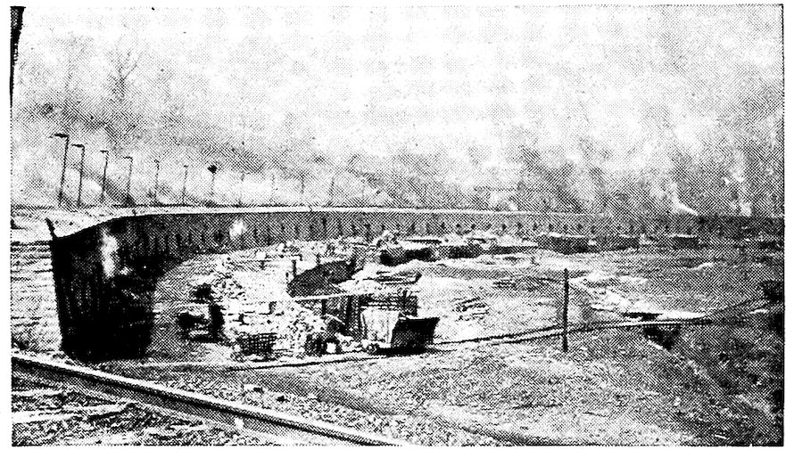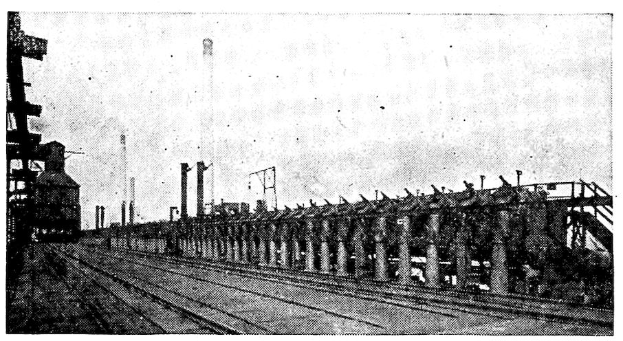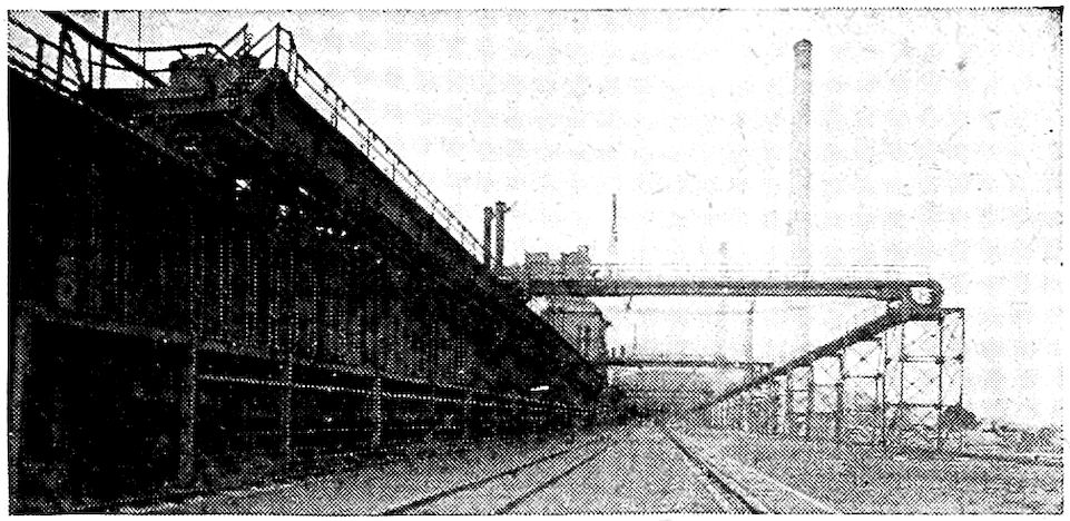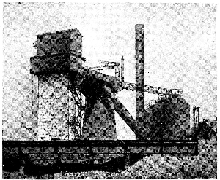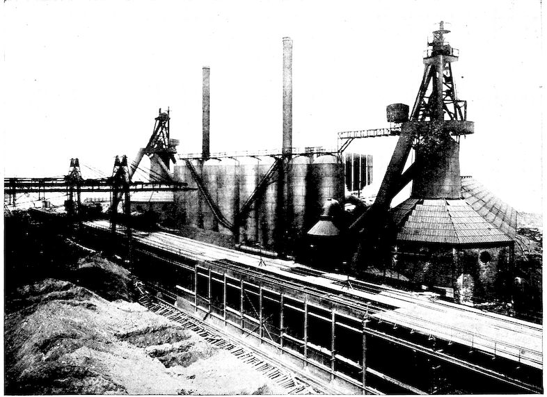 Two Modern Blast Furnaces, Showing Skip-Hoists, Cast Houses, Stoves, and Ore Pile