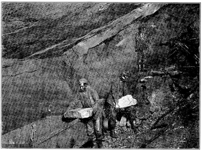 Round about them during these many centuries, as multi-colored earths or rocks, were the ores of various metals. They little dreamed that when rightly treated certain of the heavy red, yellow, or black earths which lay right at their doors could give up that most useful metal, iron. No one even had knowledge of such a substance, for, unlike copper and gold, iron never occurs “free,” having too great a 4tendency to chemically combine with other elements, for example, oxygen of the air, with which, in moist climates, it so readily forms “iron rust.” Besides, its melting point is high and so much heat and carbon are needed for its “reduction” from the ore that, during the thousands of years that had gone before, it had never been produced.