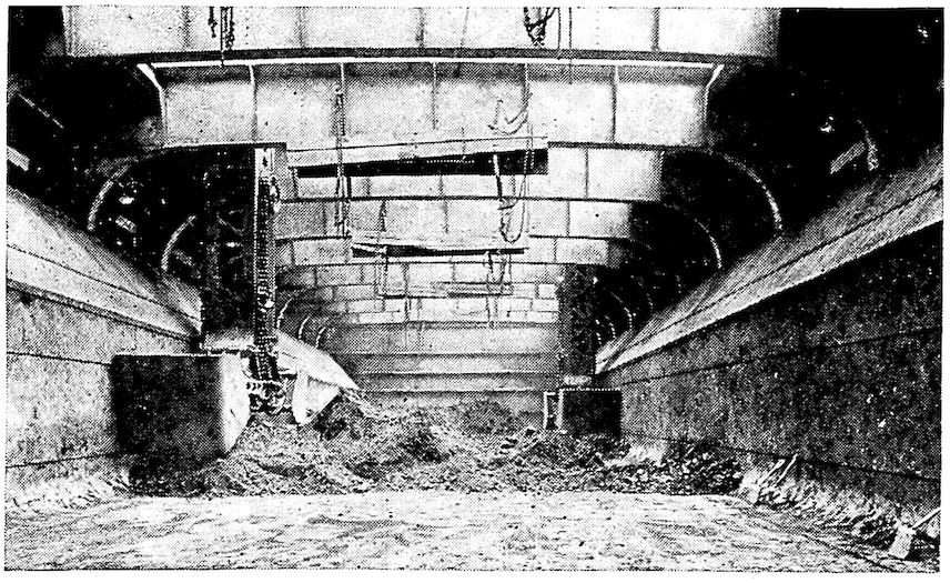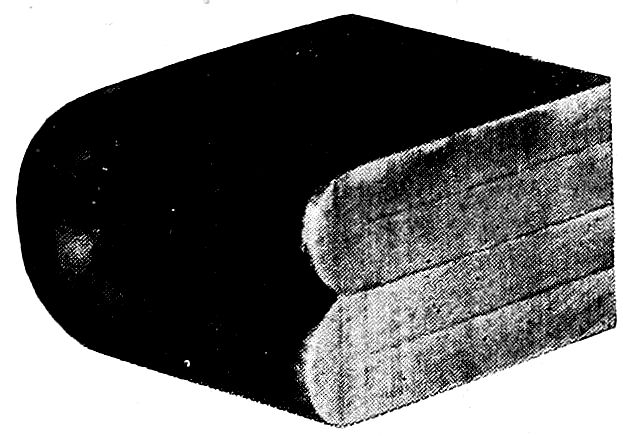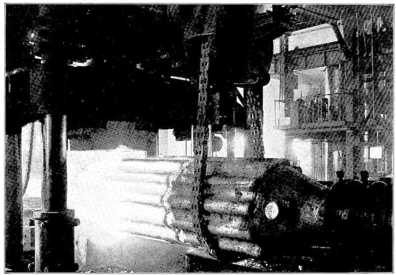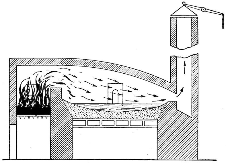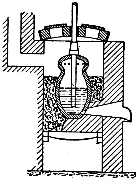 The forerunner of the modern steels was crucible steel, first made by Huntsman about the middle of the eighteenth century. Previous to his time steel had been made by the “cementation” process by which method hammered-out bars of wrought iron were given a hard steel crust by heating to a red heat in charcoal or bone dust. Huntsman’s product began to come so uniform and of such quality that his competitors were quite outdistanced. It is related that one of them took advantage of a very severe storm to gain admittance to the forest forge of Huntsman, who, he knew, could not refuse shelter at such a time. What he beheld was a very simple thing—the melting in a clay pot of pieces of cementation steel.
