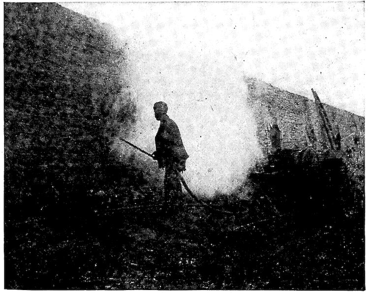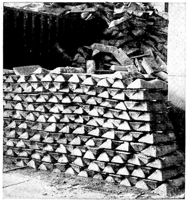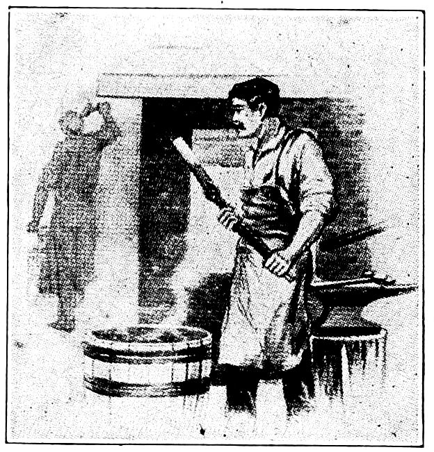 When in imagination we see the iron maker of early days sitting cross-legged on his platform between two crude bellows formed from goat skins with slits for air intakes and nozzles of bamboo, working them alternately to deliver their pitifully small streams of air into the hole in the side of a bank of clay which served as a furnace, we wonder at his patience; and after long hours of such effort his reward was only a few pounds of iron!