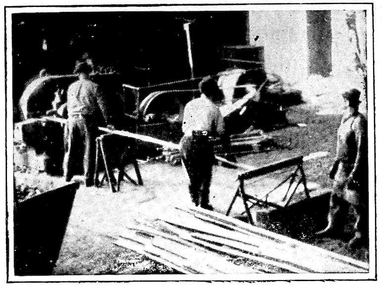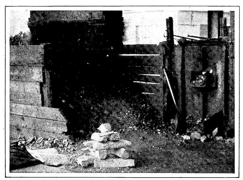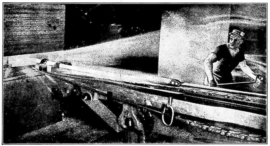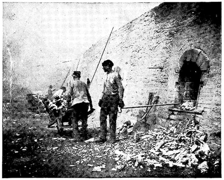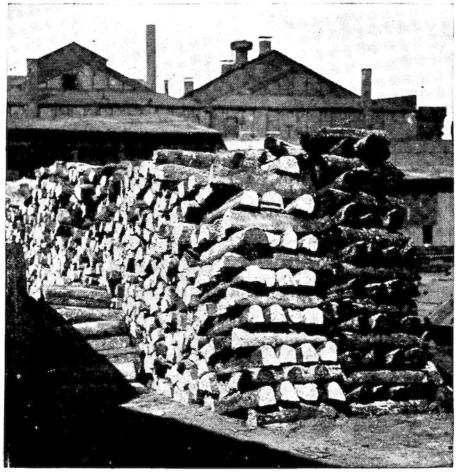 But from our modern viewpoint those early iron furnaces were queer things. The first were little more than piles of ore and wood or charcoal on the tops of hills where a brisk wind would make a hot fire. Later, with the invention of the crudest of bellows, the smelting was done in small holes in the side of banks of clay, charcoal made from the forest trees being used as fuel. Indeed, some of these types of furnaces still exist and are so operated to-day in neglected districts in Western India and elsewhere, producing their little five to 100 pound balls of iron after several hours of tedious work.