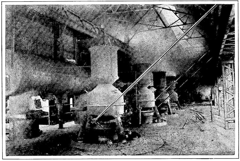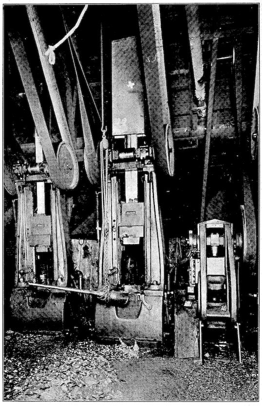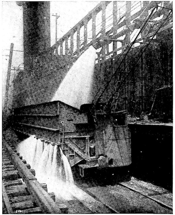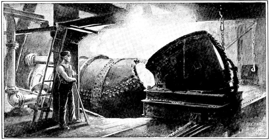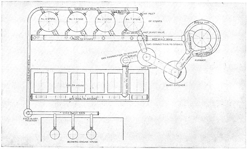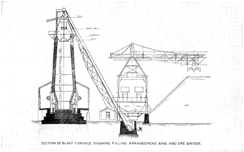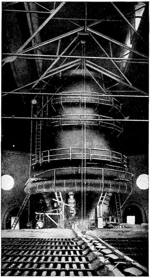 Contrast with this, if you please, the modern blast furnace with its towering height of 100 feet, its four huge heating stoves, the big blowing engines which each minute deliver to the furnace 50,000 cubic feet of blast, and the whole array of dust arresters, gas washers, and automatic ore and coke handling machinery which are essentials of this king of modern metallurgical devices. How insignificant seems the 2output of the ancient furnace when compared with the daily yield of 500 tons from this giant of to-day!