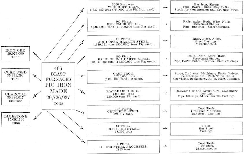 15The utilization of the great beds of high grade coking coal of eastern Pennsylvania, well known as the Connellsville district, and the discovery and development of the Lake Superior ore deposits have made the United States the leading producer of iron and steel of the world. The development of the Birmingham, Alabama, district, also has been a chapter of great importance but lack of space forbids description at this time.
