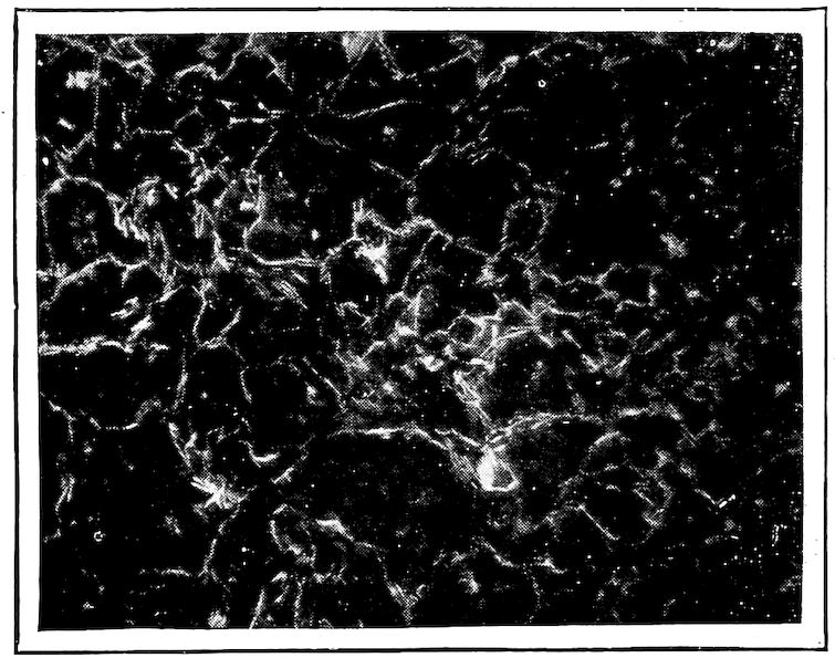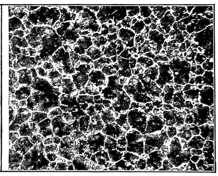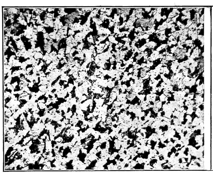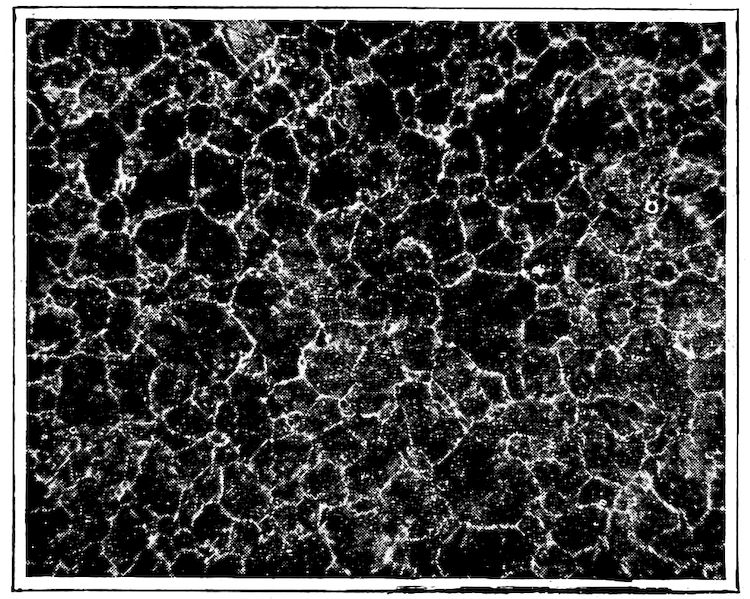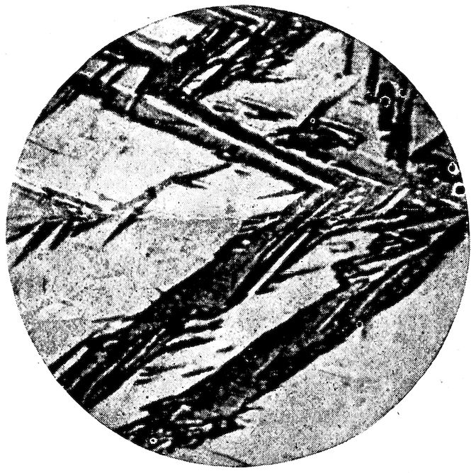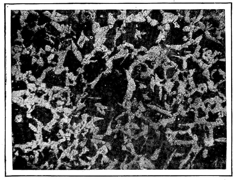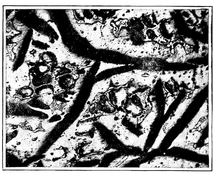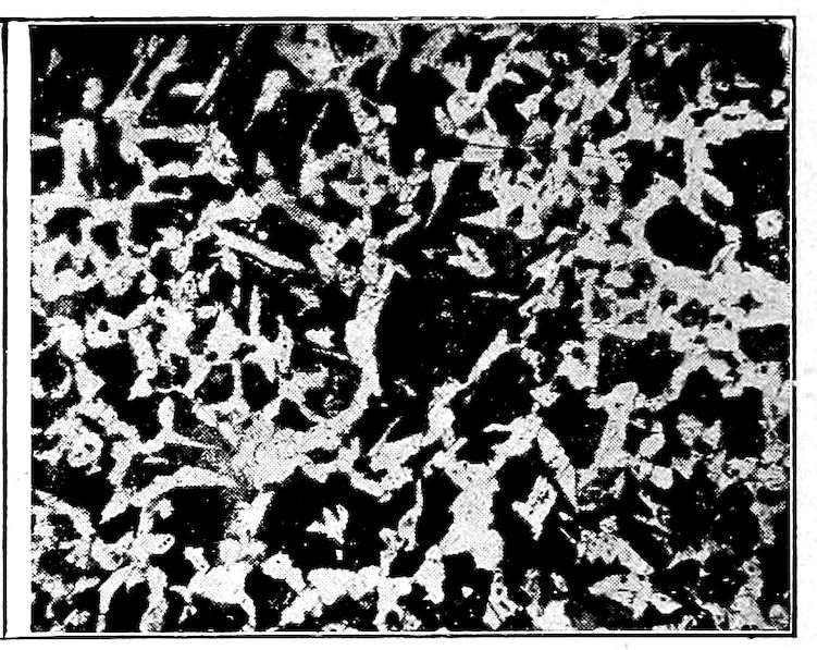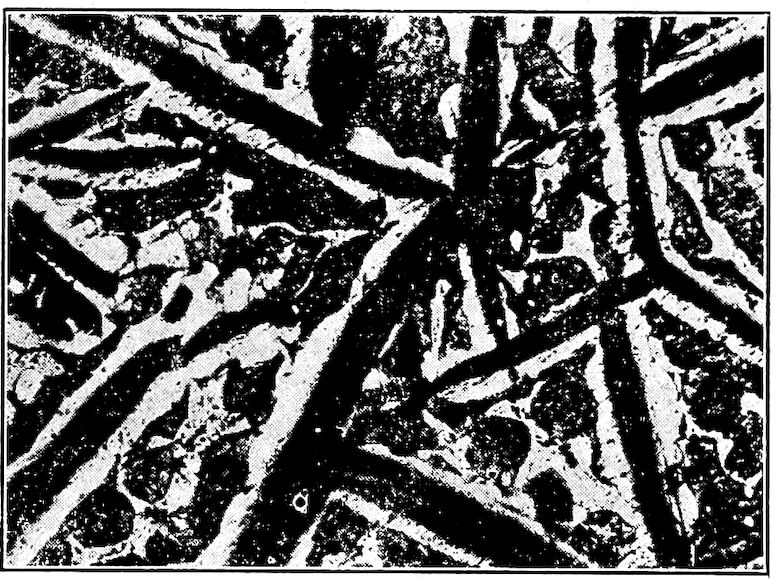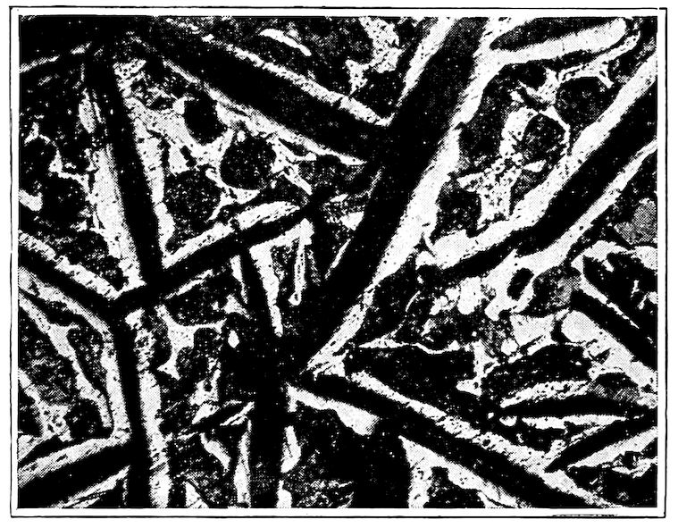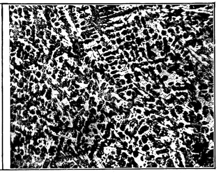 Now, having just the composition which she wants, whether arrived at from alloys lower or higher than 4.3% in carbon, Nature lets this composition freeze at once in thin alternating plates which lie side by side about and among the earlier frozen crystals of the alloy. The appearance of this typical eutectic formation under the microscope is shown on page 341.