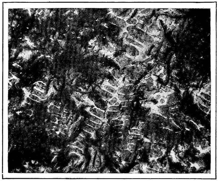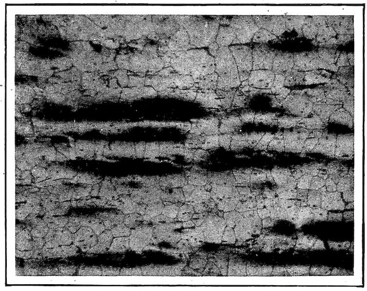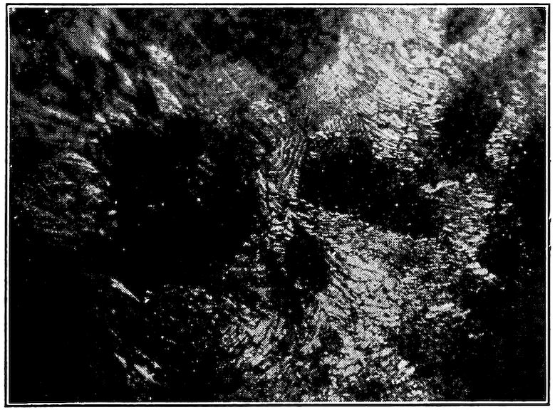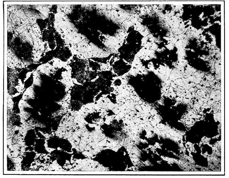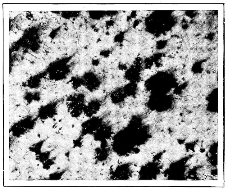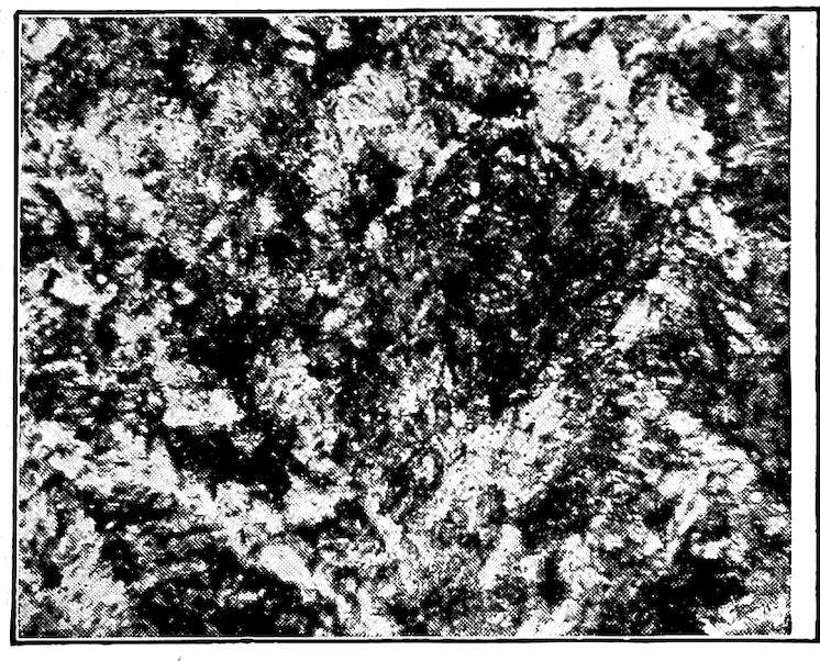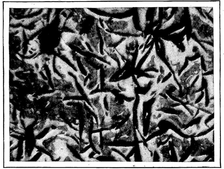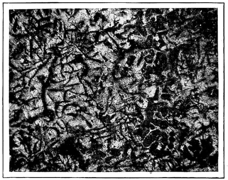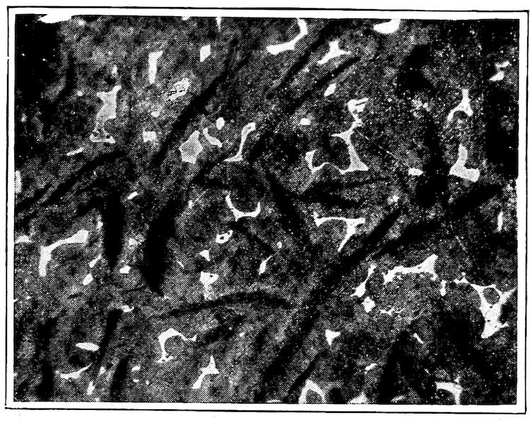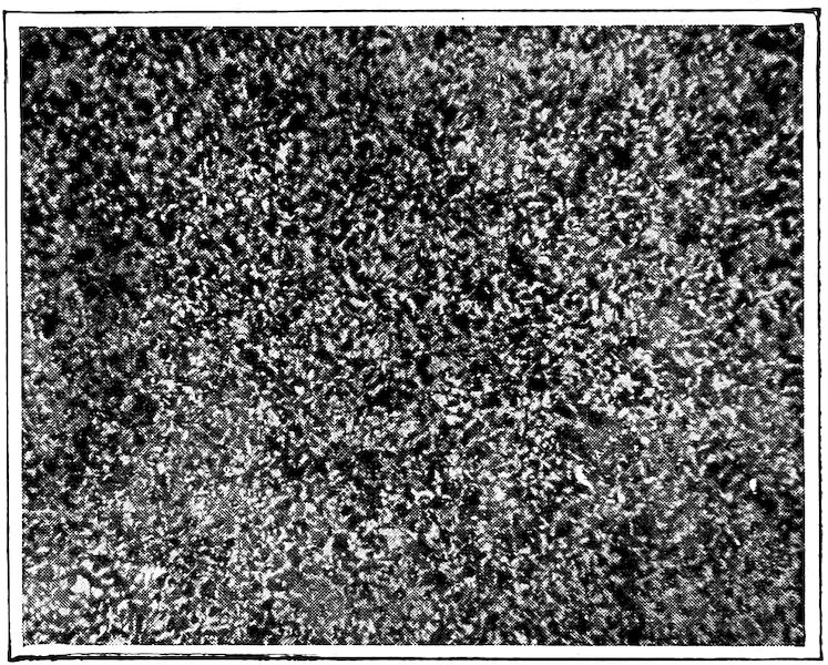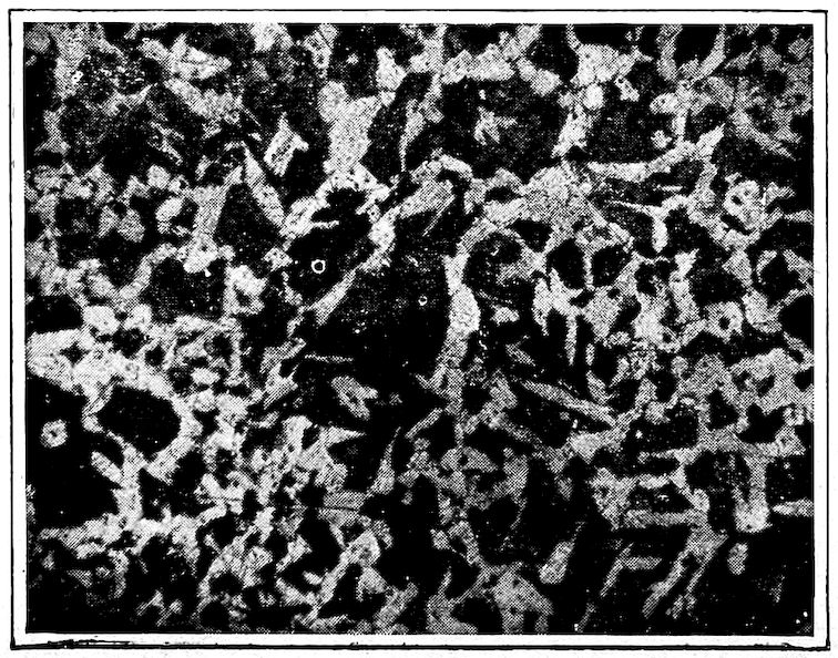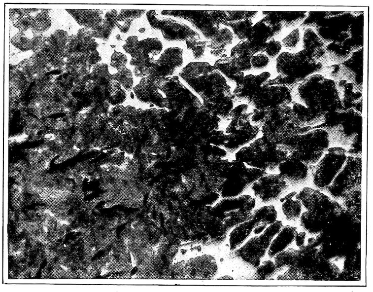 Now, having just the composition which she wants, whether arrived at from alloys lower or higher than 4.3% in carbon, Nature lets this composition freeze at once in thin alternating plates which lie side by side about and among the earlier frozen crystals of the alloy. The appearance of this typical eutectic formation under the microscope is shown on page 341.