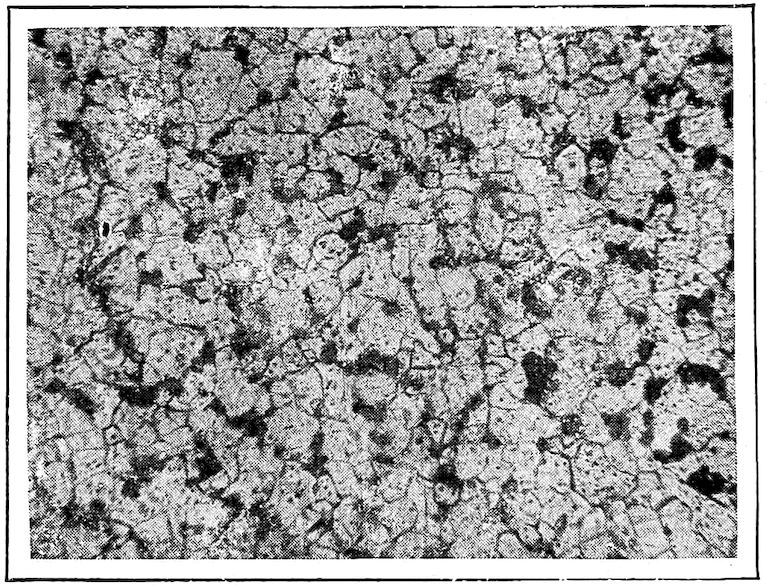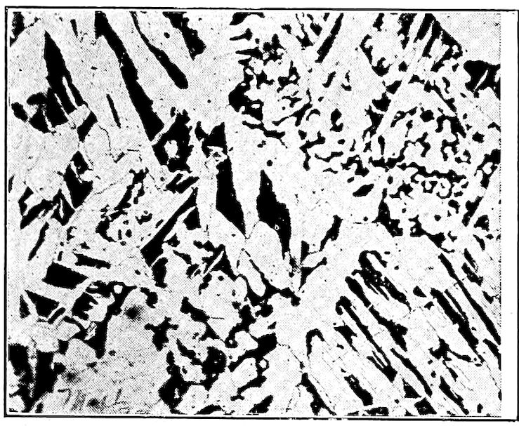 In Chapter XI we said that silicon was a “softener” as its presence brought about precipitation of the carbon as graphite throughout the cast iron, thereby softening it both 347by reason of the presence of the soft flakes of graphite and because it leaves so little of the carbon in the “combined” or hardening condition. So silicon is a ready means of bringing about decomposition of the higher temperature structures as the alloys cool.