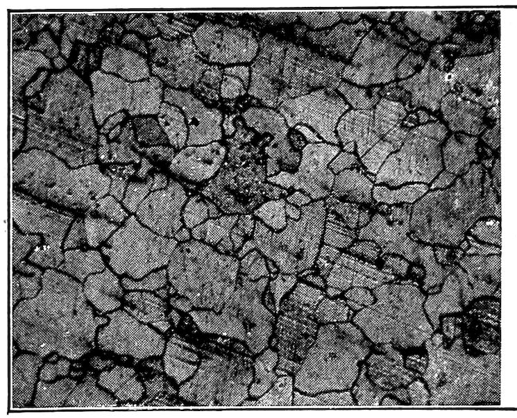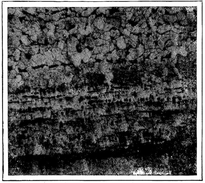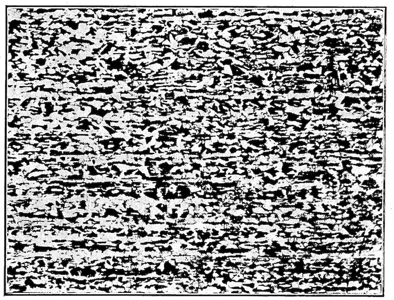 They arrive at this composition, through breaking down of the austenite and cementite structures during the cooling,—just how not having been satisfactorily determined. Consistent study is being put upon this subject and several unique and long-studied possible explanations of this section of the full equilibrium diagram have been proposed and debated, all based upon the data so far available. While much information on this subject has been gained the matter is still so much in dispute that it is best for us to venture 349nothing definite in regard to just how the changes occur. The reference books for this chapter (see page 354) give quite completely the data, theories and explanations so far available.