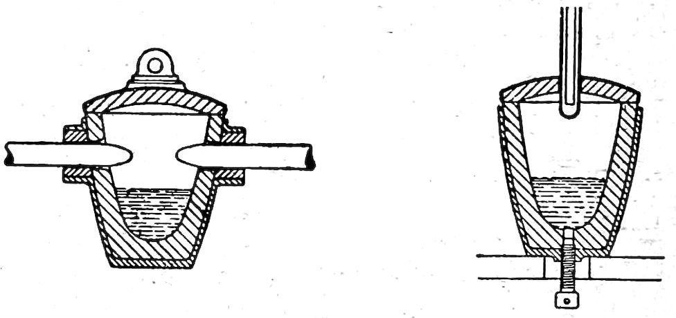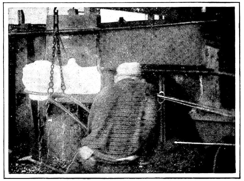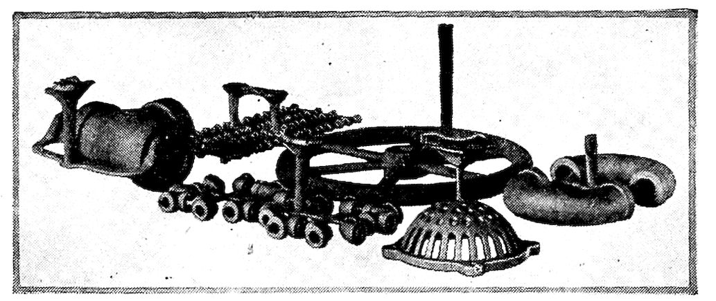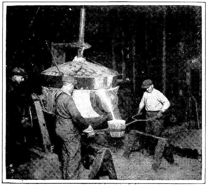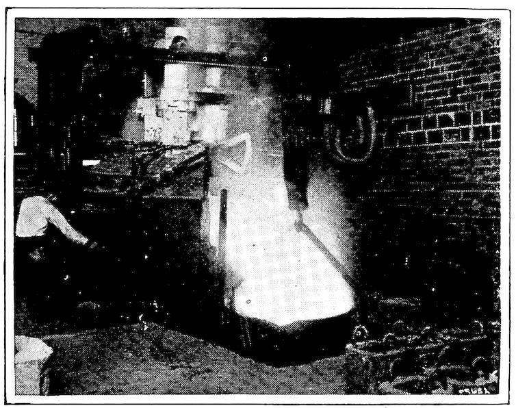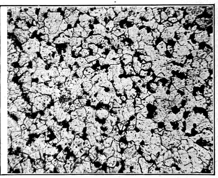 So the brittle metal (cast iron) in our kitchen ranges, for instance, is only the early malleable form of the metal 8surcharged with or having a large amount of carbon (3½ per cent to 5 per cent) in its make-up, and it is this supercarbon content which confers the fluid quality while hot and the extreme brittleness when cold. True, there are other important constituents in our modern cast iron, but for our present purpose they need not be dealt with.