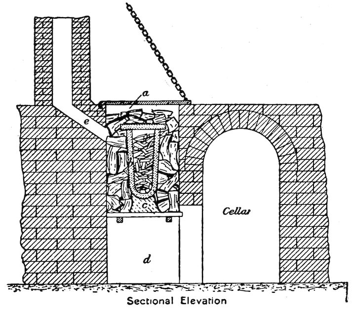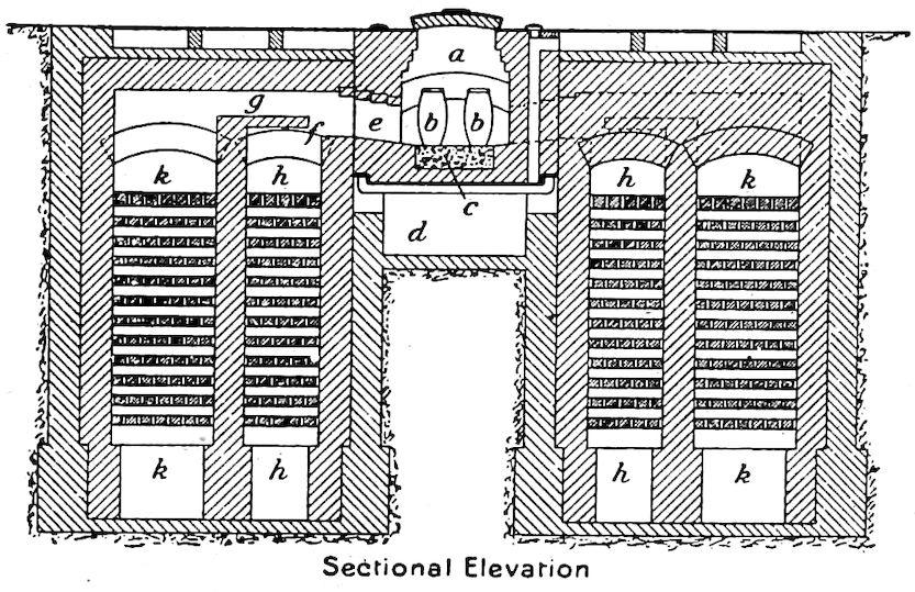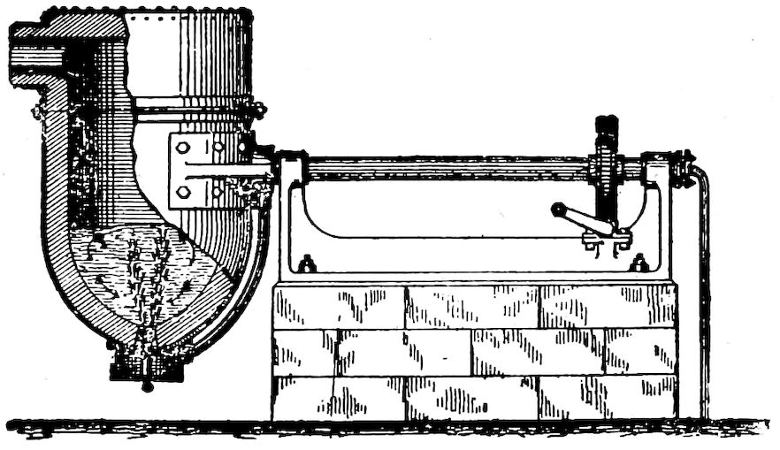 But the real forerunner of our modern blast furnace was the Catalan forge, developed in and named from Catalonia, north Spain, where it originated. The Catalan, however, and all of such crude early furnaces, including those thus far described, produced a variable kind of what we now know as “wrought iron,” and our modern “cast” iron did not appear until about 1350 when, with larger furnaces, an excess of charcoal, with greater heat and other favorable conditions, the Germans found that the pasty, difficultly melting metal could be made to absorb carbon enough to make it easily fusible. This was the secret.