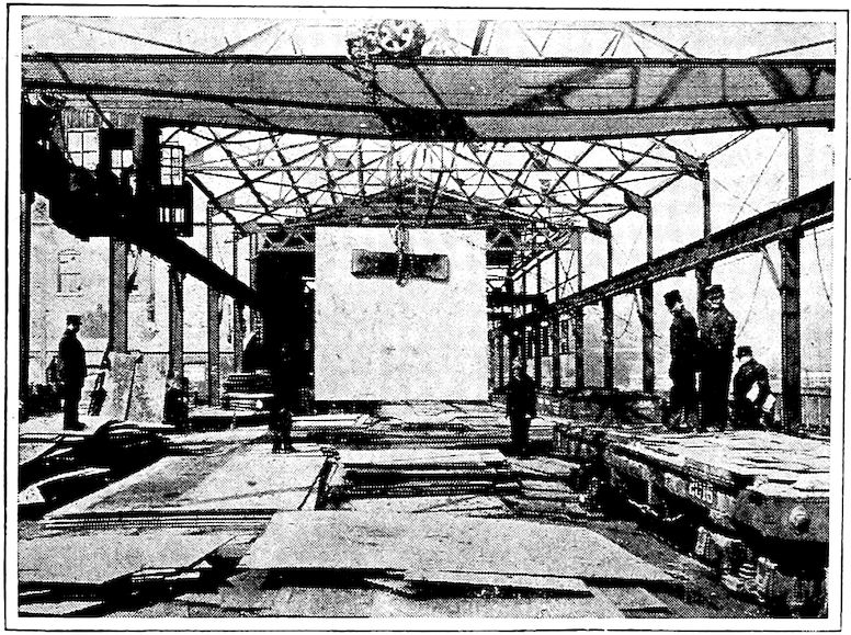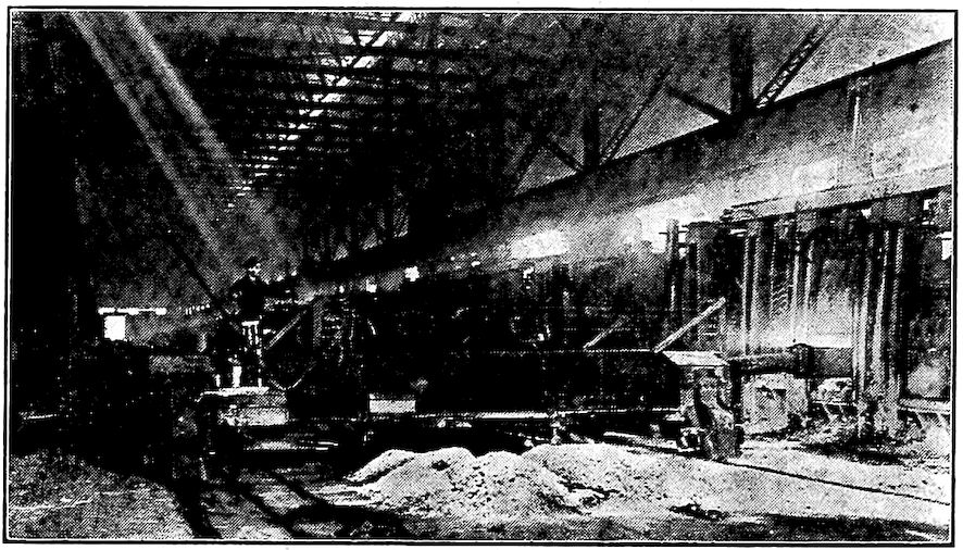 As the country developed, iron works sprung up here and there and various kinds of articles came to be regularly manufactured. Of the early plants we can only mention the Stirling Iron Works, at Warwick, New York, which made the great 186–ton chain with links weighing 140 pounds each, which spanned the Hudson River near West Point, and where in 1816 was cast the first cannon made in America; the foundry of Sharp & Curtenius, in New York, where was cast the first steam cylinder; and the Trenton Rolling Mills, which first rolled iron as fireproof structural material.