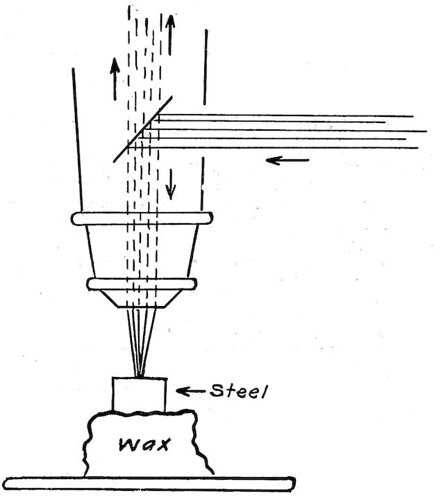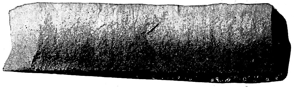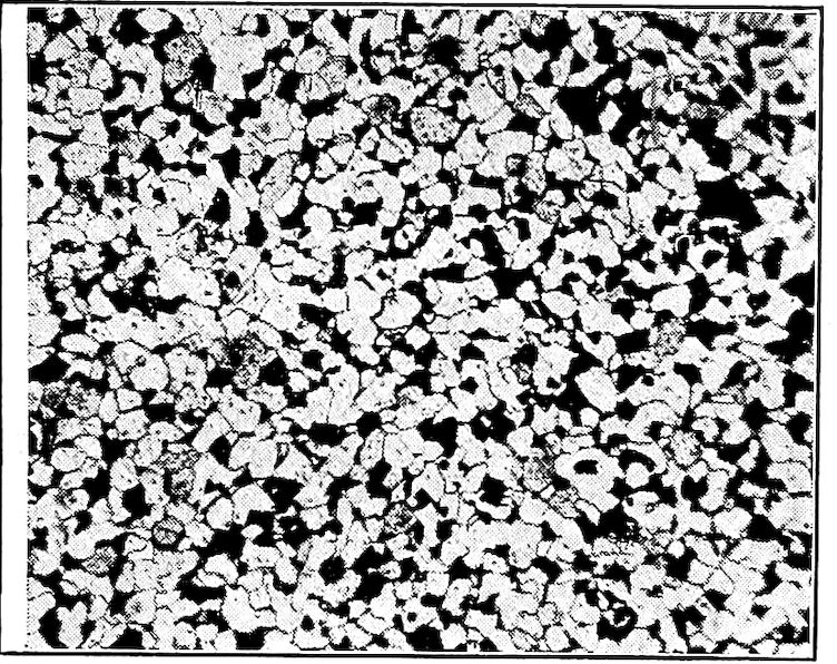 It has been stated that the ancients got only as far as balls of wrought iron. They really got further as their very fine sword steels show—the “Wootz” of India, the “Damascus” of Syria, and later the “Toledo” of Spain. These they produced by heating rich ore in very small, closed crucibles with just enough carbon (pieces of wood or green leaves) to make what we now call “carbon tool steel.” As carbon steel is simply iron which has absorbed not over 2 per cent of carbon (cast iron described above has a supersaturation with its 3½ per cent to 5 per cent of carbon and therefore is entirely different) they were able to make it in small quantities. When hardened by cooling quickly in water, a forged-out blade of this product would cleave without dulling its edge a piece of iron, it is said, or cut cleanly a tuft of silk floss tossed into the air. These steels attained well deserved renown.