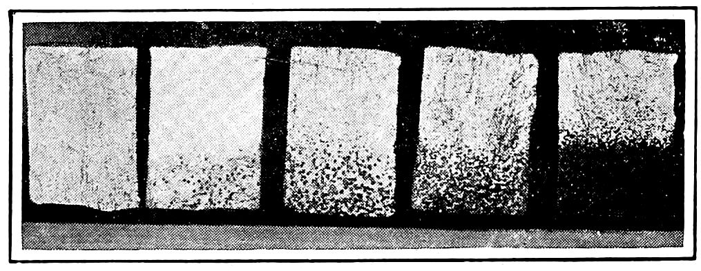 The speed of the cooling also exerts a very powerful influence in determining the amount of graphite which will separate. Other conditions being equal, the slower the cooling, the greater the decomposition with resulting graphite. Swift cooling, even such as results from the dumping of castings from the molds while at nearly white or high red heat results in insufficient graphite and otherwise harder metal. Cooling of very hot castings on a cold floor or in a current of cool air has considerable hardening effect even when the composition of the alloy would otherwise give very soft and machinable metal. In an extreme and very interesting case a few very hard cast iron flanges were each day found among the many thousands of habitually soft castings regularly produced. Each day two or three expensive “taps” were ruined by attempting the impossible—the machining of these pieces of hardened iron, which, on the outside, looked just like all the rest. It was soon discovered that two or three mold dumpers each noon and evening were warming water for “wash-up” by dropping into the pails a flange or two which were still white-hot after dumping from the molds. The men were innocent of any intention of harm but their warm water cost several hundred dollars before their method of producing it was discovered.