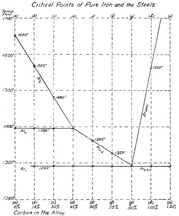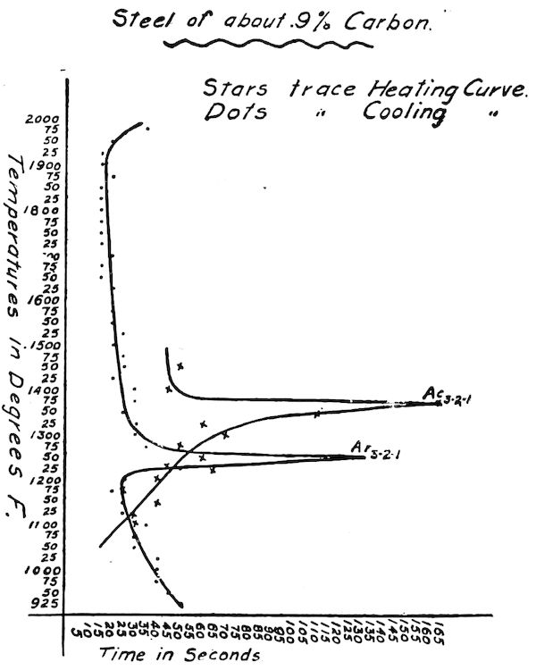 As we can never get perfectly pure iron-carbon alloys to experiment with, their content of other elements, silicon, nickel, phosphorus, etc., vitiate more or less the results obtained, but even could such pure alloys be secured we are not greatly helped since our serviceable alloys are never such. Each added element brings about greater complication and one does not wonder that in the short twenty years which have elapsed since study was seriously undertaken, metallurgical science has not entirely solved the big problem.