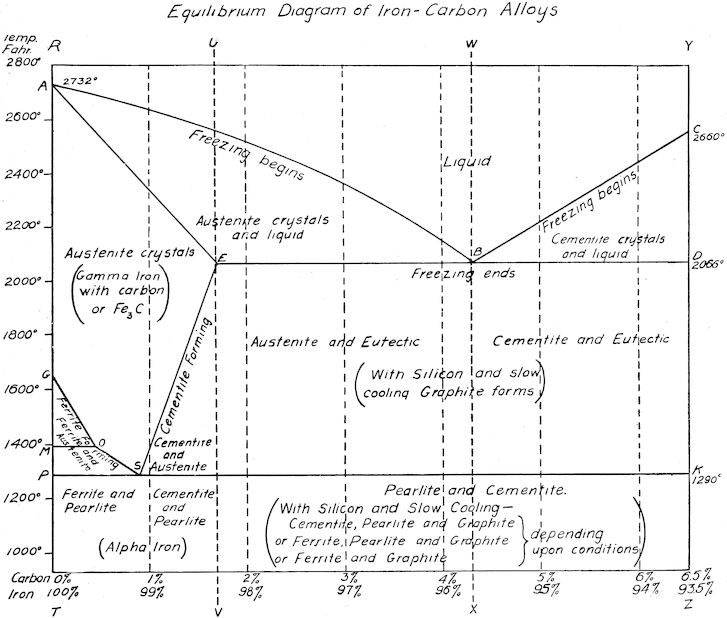 Referring to the freezing-point diagram on page 336, the upper or broad V-shaped line, ABC, indicates the temperatures at which the alloys of various percentages of iron and carbon begin to freeze, and the lower one, AED, the temperatures at which the freezing of these alloys ends. From the diagram it is readily seen that pure iron (100%), has a very high freezing-point and solidifies at once. Iron which contains about 2% of carbon begins to freeze at a much lower temperature and has a long period of solidification, while iron with 4.3% of carbon has the lowest freezing-point of the series with an extremely short solidification period or range.