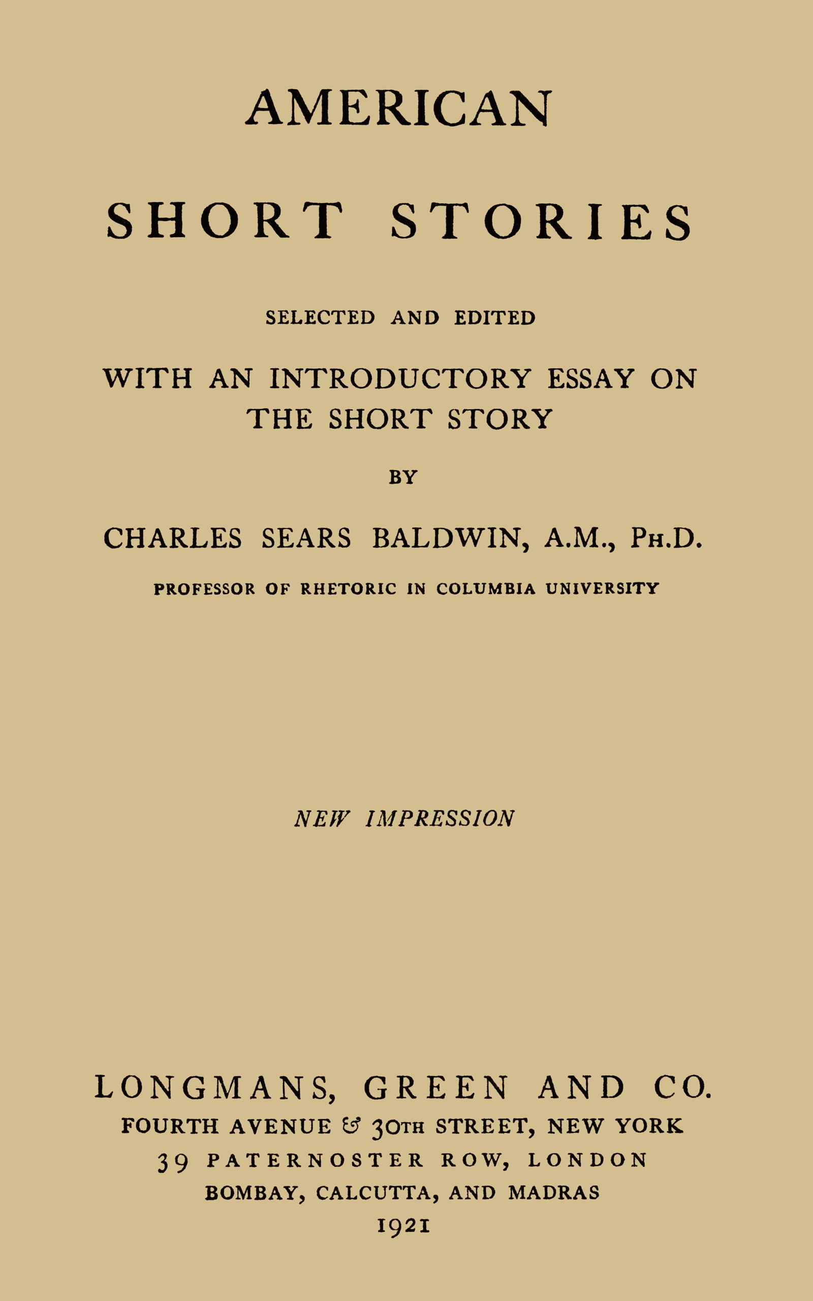 The object of this volume is not to collect the best American short stories. So delicate a choice may the more readily be left to time, since it must include some authors now living. That dramatic concentration which is the habit of a hundred writers for our magazines to-day was extremely rare before 1835; it was not common before 1870; it has become habitual within the memory of its younger practitioners. This collection, then, seeks to exhibit, and the introductory essay seeks to follow and formulate, a development. The development from inchoate tales into that distinct and self-consistent form which, for lack of a distinctive term, we have tacitly agreed to call the short story is a chapter of American literary history.