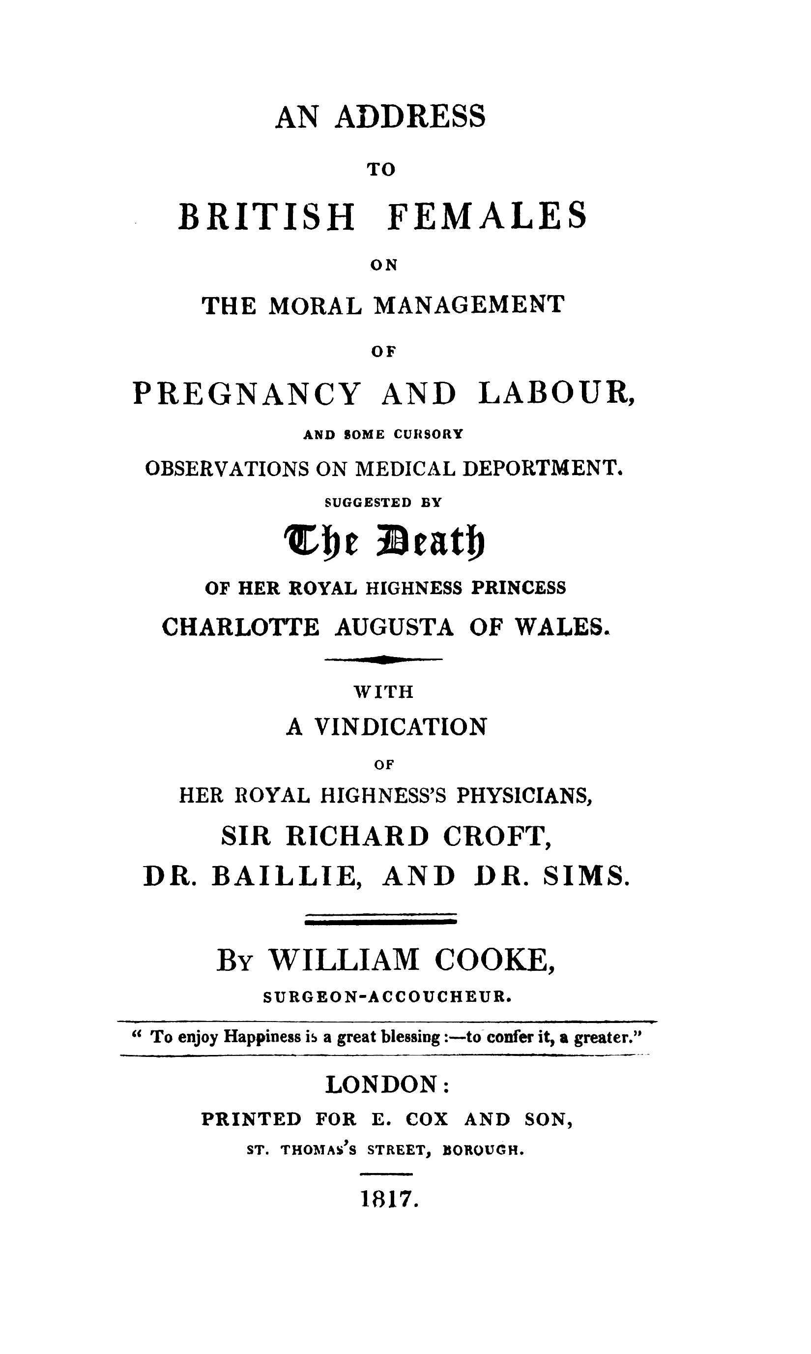 It redounds to the credit of the clergy, not only in the established church, but equally of all denominations, that the mournful event has been observed in the most obvious and impressive manner, and their office been made subservient to the condolence and moral improvement of society. Yet is there one class of persons, most interesting from their sex, from their condition in life, and from their extraordinary participation in the event, owing to peculiar circumstantials of coincidence, which, though accessible to the ordinary means of consolation, demands the most solicitous and encouraging attention. It is unnecessary here to observe, that the persons alluded to are females in the state of pregnancy, and more particularly those, who, like Her Royal Highness, are anticipating the first parturition.