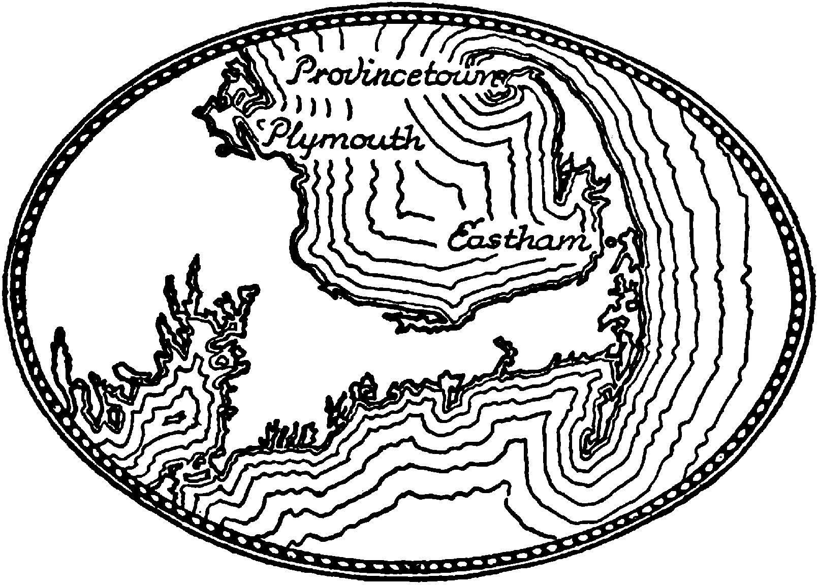 The cliff ends, and a wall of ocean dunes carries on the beach. Five miles long, this wall ends at a channel over whose entrance shoals the ocean sweeps daily into a great inlet or lagoon back of the dunes, an inlet spaced with the floors of tidal islands and traced with winding creeks—the inlet of Eastham and Orleans. Very high tides, covering the islands, sometimes turn this space into bay. Westward over the channels and the marshland one looks to the uplands of the Cape, here scarce a good two miles wide. At Eastham, the land is an open, rolling moor. West over this lies Cape Cod Bay. A powerful tribe of Indians, the Nausets, once inhabited this earth between the seas.