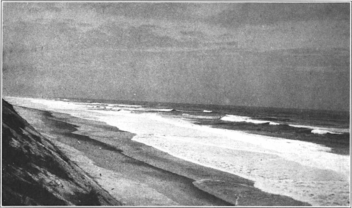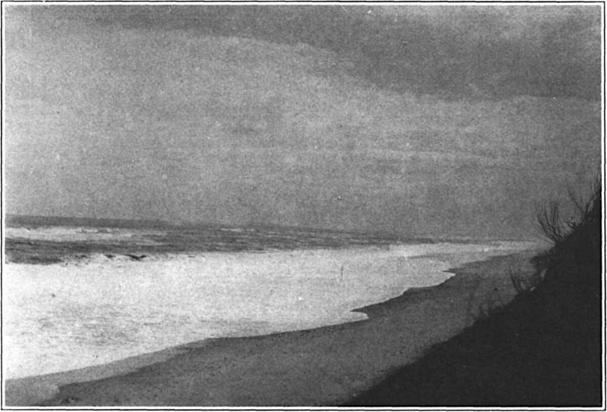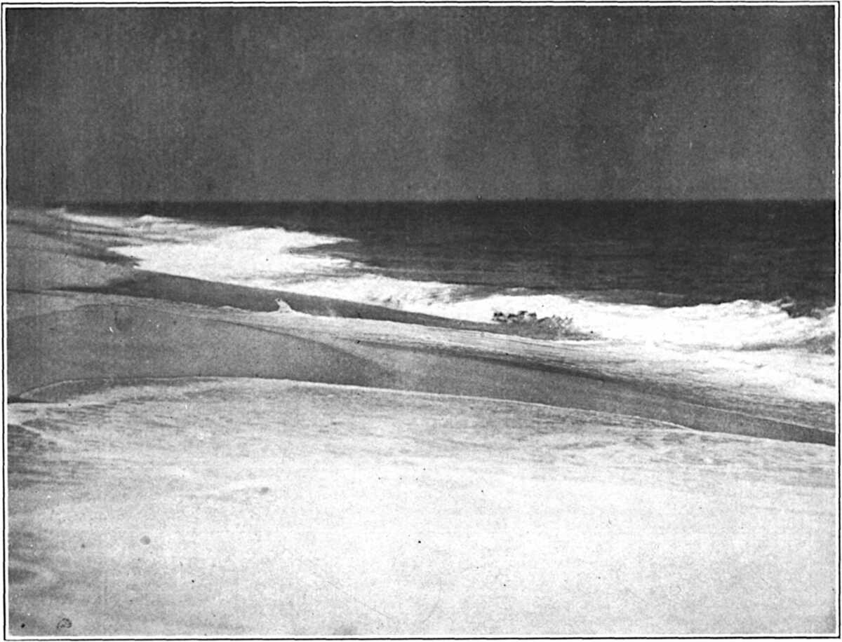 I had spent an afternoon ashore with friends, and they had driven me to Nauset Station just after nine o’clock. The moon, two days from the full, was very lovely on the moors and on the channels and flat, moon-green isles of the lagoon; the wind was southerly and light. Moved by its own enormous rhythms, the surf that night was a stately incoming of high, serried waves, the last wave alone breaking. This inmost wave broke heavily in a smother and rebound of sandy foam,(178) and thin sheets of seethe, racing before it up the beach, vanished endlessly into the endless thirst of the sands. As I neared the surf rim to begin my walk to the southward, I saw that the beach close along the breakers, as far as the eye would reach, was curiously atwinkle in the moonlight with the convulsive dance of myriads of tiny fish. The breakers were spilling them on the sands; the surf was aswarm with the creatures; it was indeed, for the time being, a surf of life. And this surf of life was breaking for miles along the Cape.