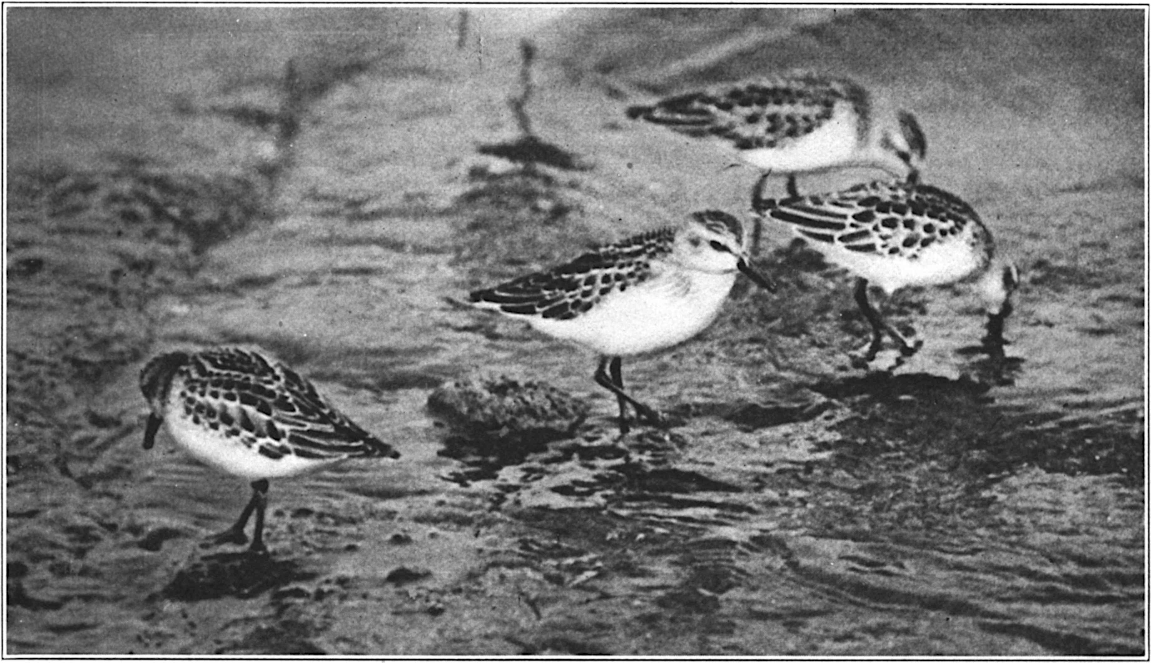 No aspect of nature on this beach is more mysterious to me than the flights of these shore-bird constellations. The constellation forms, as I have hinted, in an instant of time, and in that same instant develops its own will. Birds which have been feeding yards away from each other, each one individually busy for his individual(24) body’s sake, suddenly fuse into this new volition and, flying, rise as one, coast as one, tilt their dozen bodies as one, and as one wheel off on the course which the new group will has determined. There is no such thing, I may add, as a lead bird or guide. Had I more space I should like nothing better than to discuss this new will and its instant of origin, but I do not want to crowd this part of my chapter, and must therefore leave the problem to all who study the psychic relations between the individual and a surrounding many. My special interest is rather the instant and synchronous obedience of each speeding body to the new volition. By what means, by what methods of communication does this will so suffuse the living constellation that its dozen or more tiny brains know it and obey it in such an instancy of time? Are we to believe that these birds, all of them, are machina, as Descartes long ago insisted, mere mechanisms of flesh and bone so exquisitely alike that each cogwheel brain, encountering the same environmental forces, synchronously lets slip the same mechanic ratchet? or is there some psychic relation between these creatures? Does some current flow through them and between them as they fly?(25) Schools of fish, I am told, make similar mass changes of direction. I saw such a thing once, but of that more anon.