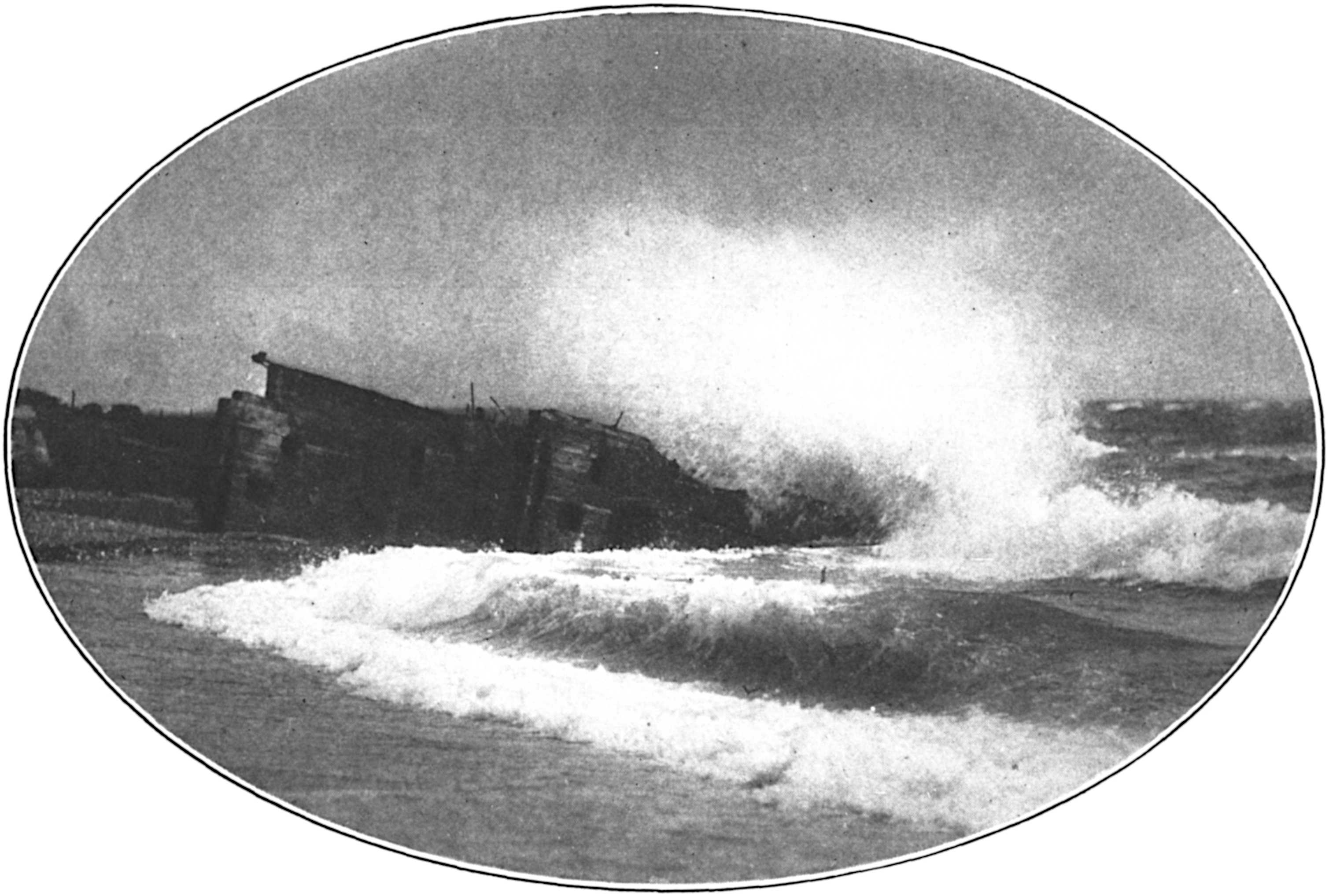 Fantastic things were visible at sea. Beaten down by the rain, and sheltered by the Cape itself from the river of west wind, the offshore brim of ocean remained unusually calm. The tide was about halfway up the beach, and rising, and long parallels of low waves, forming close inshore,(188) were curling over and breaking placidly along the lonely, rain-drenched miles. The intense crackling flares and quiverings of the storm, moving out to sea, illumined every inch of the beach and the plain of the Atlantic, all save the hollow bellies of the little breakers, which were shielded from the light by their overcurling crests. The effect was dramatic and strangely beautiful, for what one saw was a bright ocean rimmed with parallel bands of blackest advancing darkness, each one melting back to light as the wave toppled down upon the beach in foam.