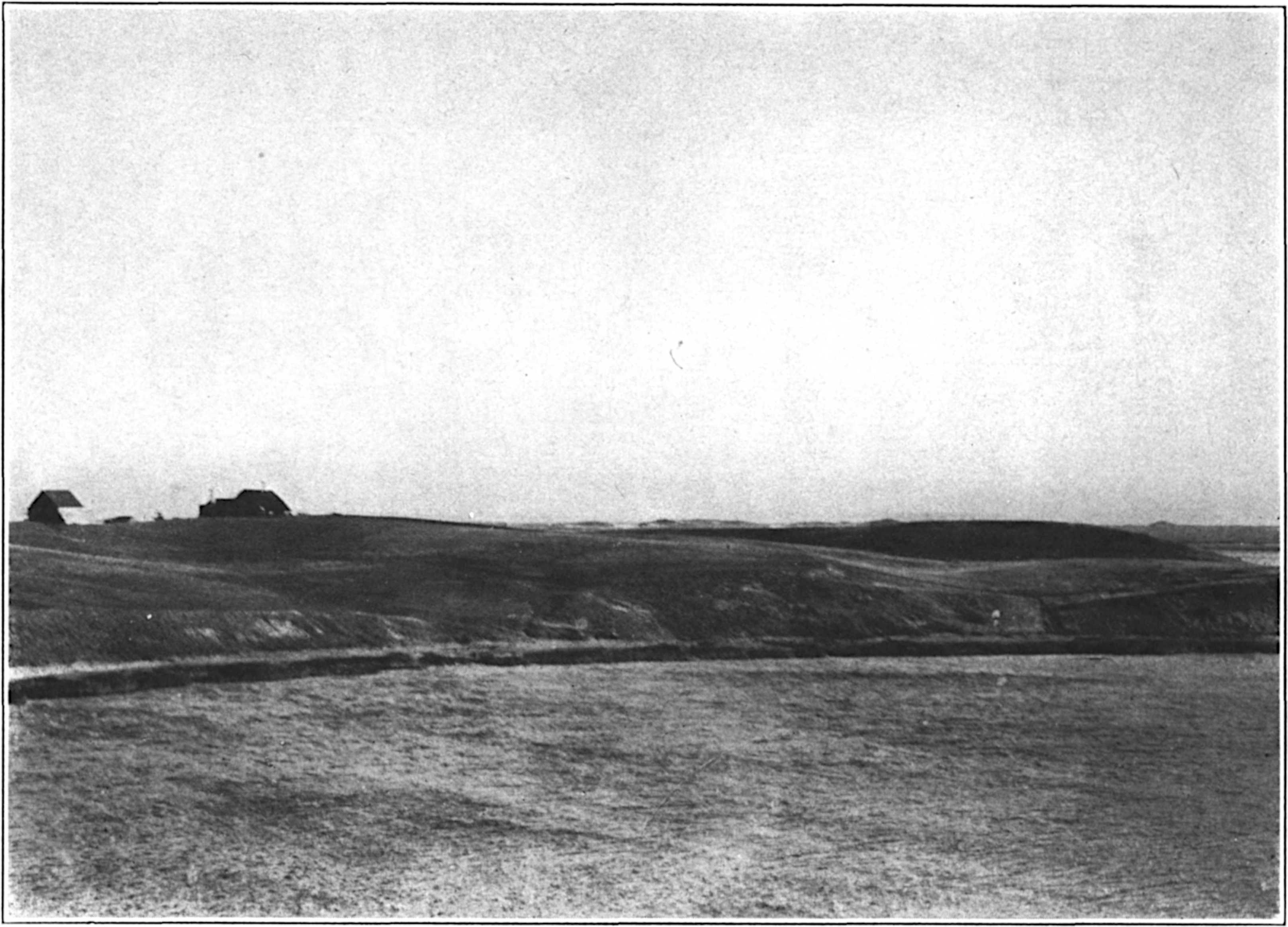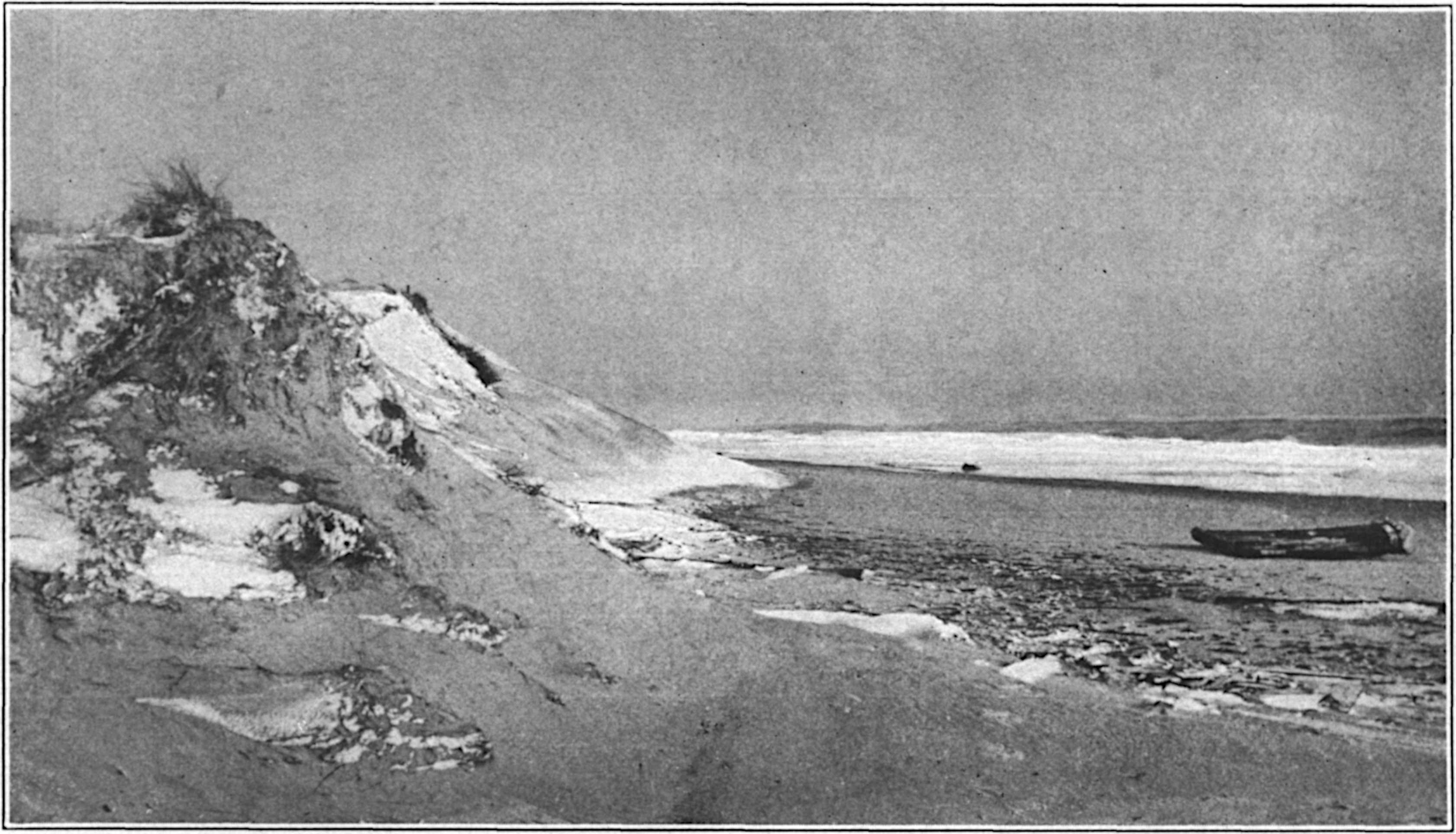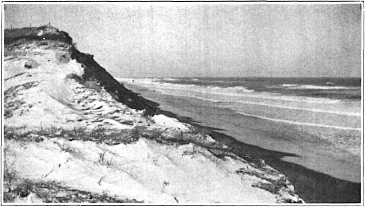 The cliff I write of and the bordering beach face the Atlantic on the forearm of the Cape. This outer earth is now scarce more than a great dyke or wall some twenty-five miles long and only three and four miles wide. At Provincetown it rises from the sea, beginning there in a desert of dunes and sand plains of the ocean’s making. These sands curve inland toward the continent, bending toward Plymouth even as a hand may be bent down at the wrist, and Provincetown harbour lies in the curve of palm and fingers. At Truro, the wrist of the Cape—the forearm simile being both exact and inescapable—the land curve falls from the east and west down through an arc to the north and south, and the earth cliff begins and rises rather suddenly to its greatest elevation. South by east from the Highland Light to Eastham and Nauset Coast Guard Station, the rampart fronts the sea, its sky line being now a progress of long undulations, now a level as military as a battlement, hollows and mounded hills here and(5) there revealing the barren moorland character of the country just above. At Nauset, the cliff ends, the sea invades the narrowing land, and one enters the kingdom of the dunes.