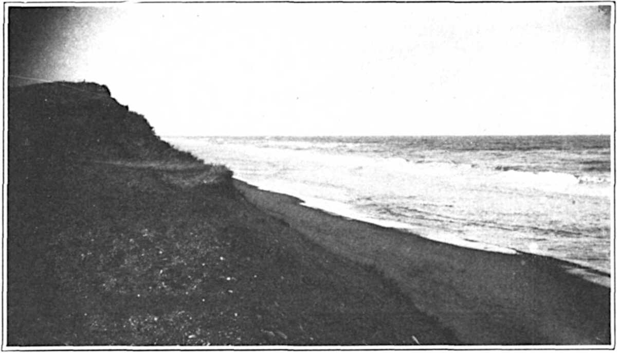 Often spoken of as being entirely glacial, this bulwark is really an old land surfaced with a new. The seas broke upon these same ancient bounds long before the ice had gathered or the sun had fogged and cooled. There was once, so it would seem, a Northern coastal plain. This crumbled at its rim, time and catastrophe changed its level and its form, and the sea came inland over it through the years. Its last enduring frontier roughly corresponds to the wasted dyke of the cliff. Moving down into the sea, later glaciations passed over the old beaches and the fragments of the plain, and, stumbling over them, heaped upon these sills their accumulated drift of gravels, sand, and stones. The warmer sea and time prevailing, the ice cliff retreated westward through its fogs, and presently the waves coursed on to a new, a transformed and lifeless, land.