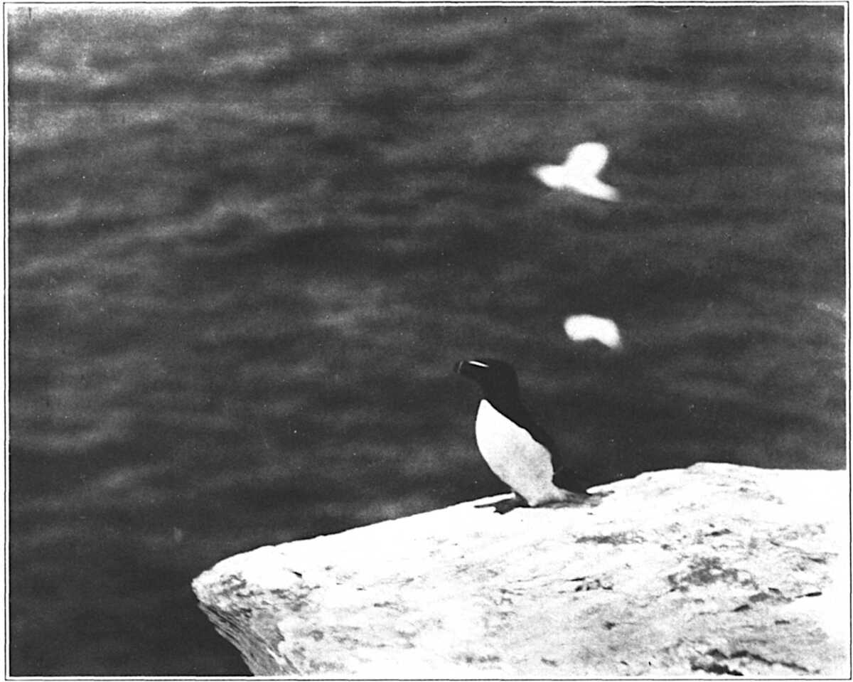 The great majority of these birds are males bringing food to their mates and the new-born young. The catch usually consists of three- and four-inch sand eels, but I occasionally see birds flying bow-down with tinker mackerel. Sometimes a bird passes carrying two “eels,” holding the pair as best he can.