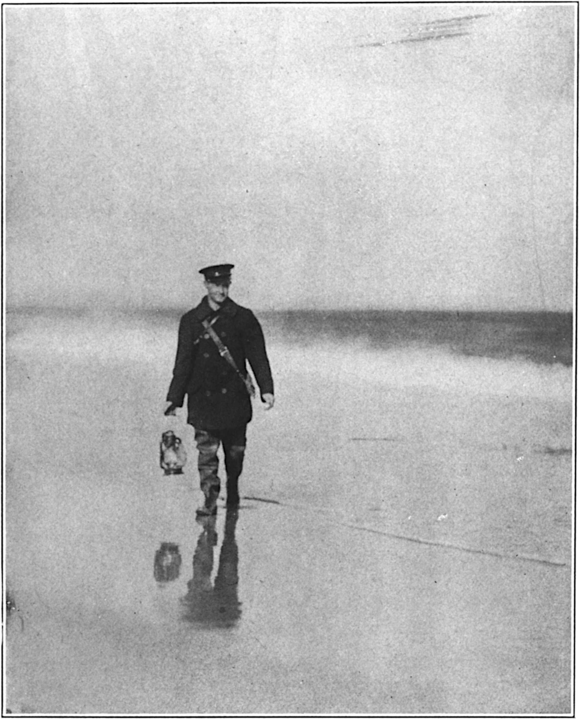 Southward, then, I turned, and because the flooded runnels were deep close by the station, I could not cross them and had to walk their inner shores. The tide had fallen half a foot, perhaps, but the breakers were still leaping up against the bar as against a wall, the greater ones still spilling over sheets of vanishing foam.