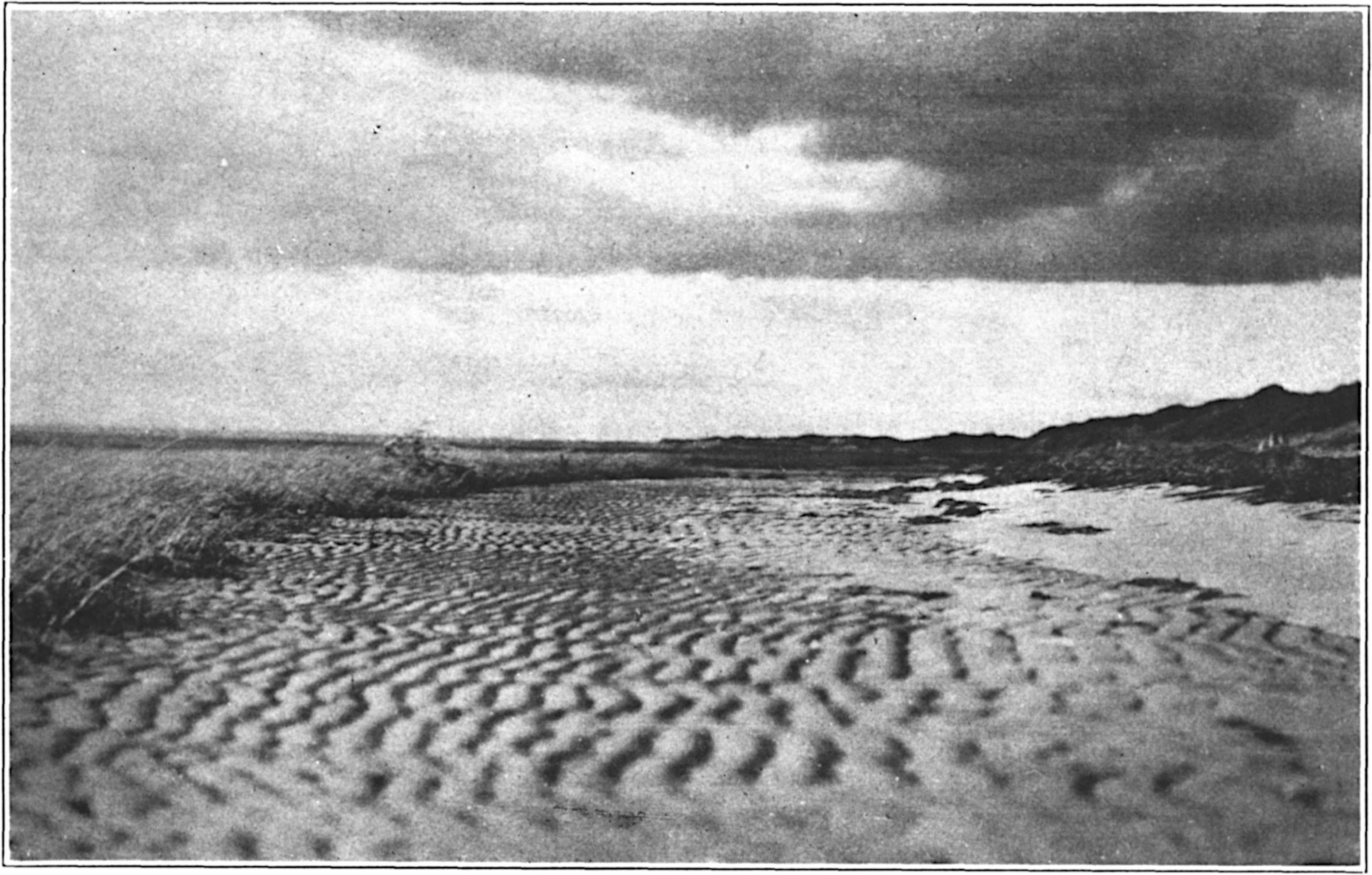 So came August to its close, ending its last day with a night so luminous and still that a mood came over me to sleep out on the open beach under the stars. There are nights in summer when darkness and ebbing tide quiet the universal wind, and this August night was full of that quiet of absence, and the sky was clear. South of my house, between the bold fan of a dune and the wall of a plateau, a sheltered hollow opens seaward, and to this nook I went, shouldering my blankets sailorwise. In the star-shine the hollow was darker than the immense and solitary beach, and its floor was still pleasantly warm with the overflow of day.