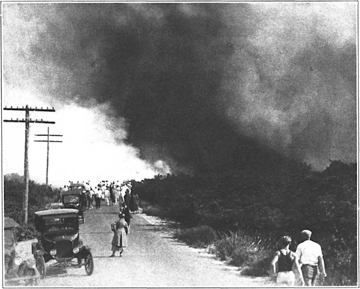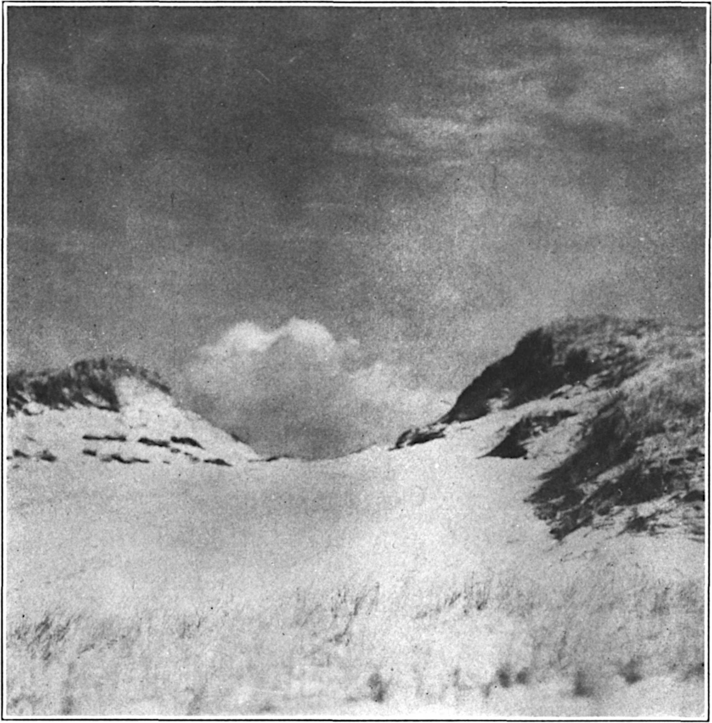 The sand here has a life of its own, even if it is only a life borrowed from the wind. One pleasant summer afternoon, while a high, gusty westerly was blowing, I saw a little “wind devil,” a miniature tornado six feet high, rush at full speed out of a cut, whirl itself full of sand upon the beach, and spin off breakerward. As it crossed the beach, the “devil” caught the sun, and there burst out of the sand smoke a brownish prism of burning, spinning, and fantastic colour. South of me, the dune I call “big dune” now and then goes through a curious performance. Seen(15) lengthwise, the giant has the shape of a wave, its slope to the beach being a magnificent fan of purest wind-blown sand, its westward slope a descent to a sandy amphitheatre. During a recent winter, a coast guard key post was erected on the peak of the dune; the feet of the night patrols trod down and nicked the crest, and presently this insignificant notch began to “work” and deepen. It is now eight or nine feet wide and as many deep. From across the marshes, it might be a kind of great, roundish bite out of the crest. On windy autumn days, when the sand is still dry and alive, and westerly gusts and currents take on a genuine violence, the loose sand behind the dune is whirled up by the wind and poured eastward through this funnel. At such times the peak “smokes” like a volcano. The smoke is now a streaming blackish plume, now a thin old-ivory wraith, and it billows, eddies, and pours out as from a sea Vesuvius.