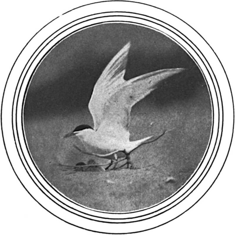 Sterna hirundo, the common tern—Wilson’s tern, some call him—is indeed a lovely bird. His dominant colours are pearl-grey and white, his wings are bent, he is from thirteen to sixteen inches long, and he is marked by a black hood, an orange-coral bill tipped with black, and bright vermilion-orange legs and feet. To my ear, the(202) bird’s call has a cawing quality; it is, indeed, a cawing screech with an “e” sound and a high pitch. Harsh though it is, it is not disagreeable; moreover, it is capable of wide emotional variations. Going south on a recent day along the dunes, I arrived at the place where the parent terns, homing from the sea, were crossing the sand bar on their way to their nests, and as the birds came in sight of their mates and their fledglings, their cry changed its quality, and took on a kind of wild, harsh tenderness that was touching to hear.