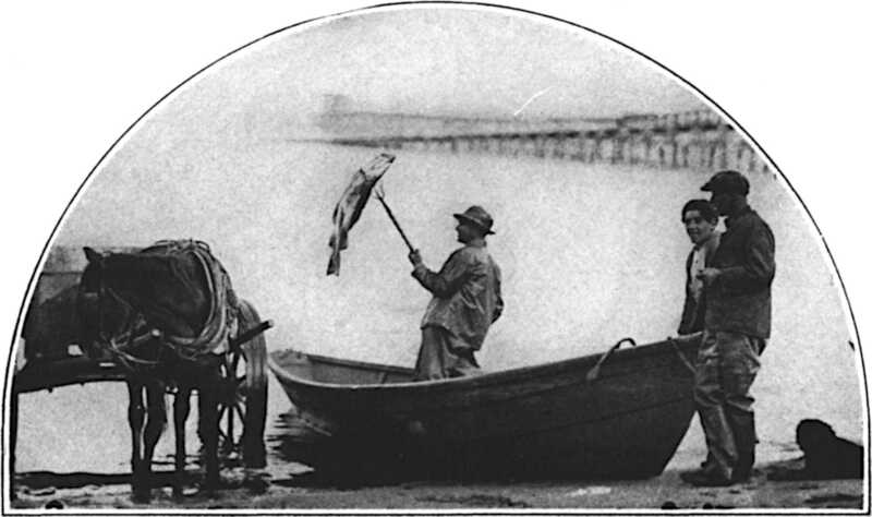 A little after eleven came Bill Eldredge to the door, with a grin on his face and one hand held behind his back. “Have you ordered to-morrow’s dinner yet?” said he. “No.” “Well, here it is,” and Bill produced a fine cod from behind his back. “Just found him right in front of your door, alive and flopping. Yes, yes, haddock and cod often chase those sand eels in with the bigger fish; often find them on the beach about this time of the year. Got any place to keep him?(181) Let me have a piece of string and I’ll hang him on your clothesline. He’ll keep all right.” With a deft unforking of two fingers, Bill drew the line through the gills, and as he did so the heavy fish flopped noisily. No fear about him being dead. Make a nice chowder. Bill stepped outside; I heard him at the clothesline. Afterward we talked till it was time for him to shoulder his clock and Coston case again, pick up his watch cap, whistle in his little black dog, and go down over the dune to the beach and Nauset Station.