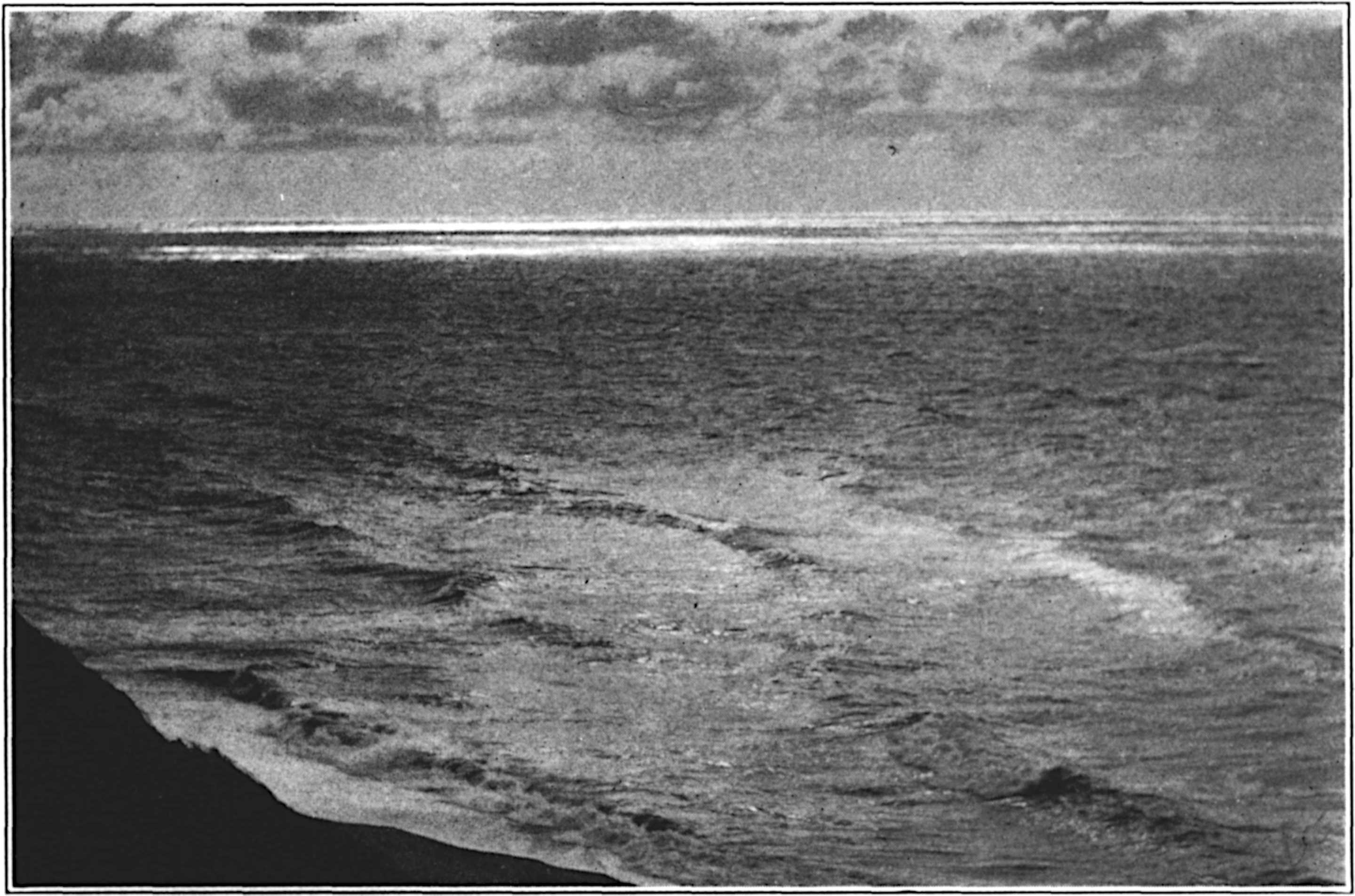 The tide had ebbed in the pools, and their edges were wet and dark. There was a strange contrast between the still levels of the pool and the seethe of the sea. I kept close to the land edge of the lagoons, and as I advanced my boots kicked wet spatters of sand ahead as they might have kicked particles of snow. Every spatter was a crumb of phosphorescence; I walked in a dust of stars. Behind me, in my footprints, luminous patches burned. With the double-ebb moonlight and tide, the deepening brims of the pools took(183) shape in smouldering, wet fire. So strangely did the luminous speckles smoulder and die and glow that it seemed as if some wind were passing, by whose breath they were kindled and extinguished. Occasional whole breakers of phosphorescence rolled in out of the vague sea—the whole wave one ghostly motion, one creamy light—and, breaking against the bar, flung up pale sprays of fire.