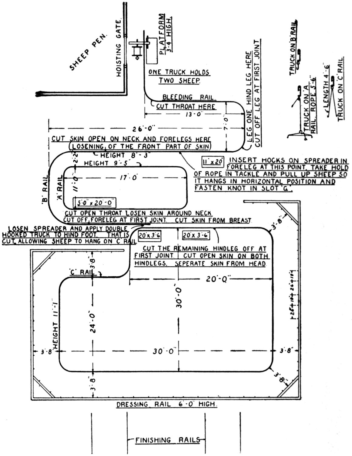 (20) Sheep Killing.—To be the complete expense for dressing sheep from their receipt in the pens to delivery to chill[459] rooms; including all occupations, necessary thereto except the disposal of sheep offal and sheep by meats.