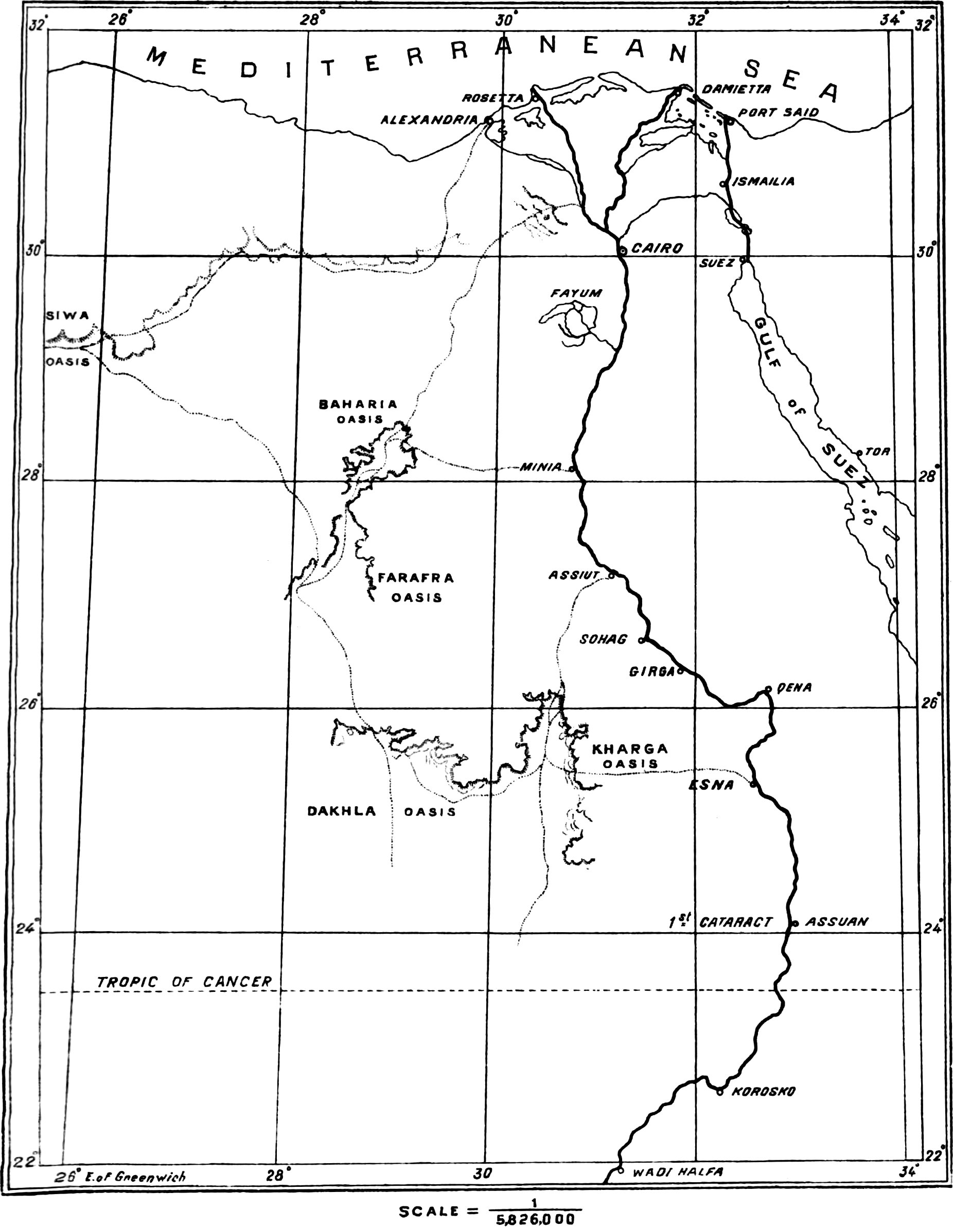 | Minia Railway Station, long. E. of Greenwich | 30° | 45′ | 39″ |