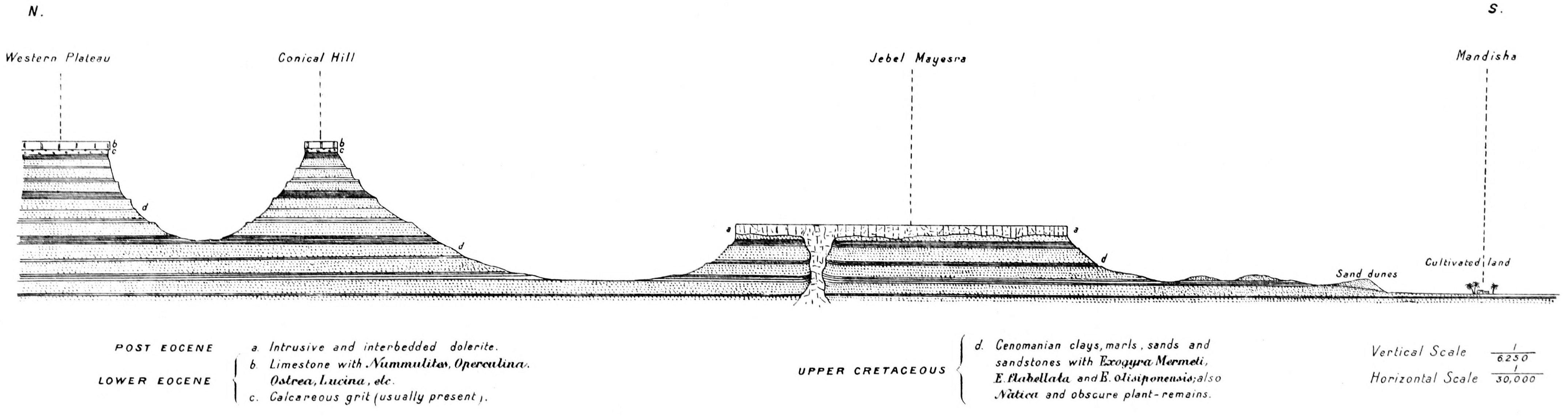 “At the north-east and east of the Baharia Oasis the Upper Mokattam beds, characterized by Ostrea Fraasi and O. Cloti (as kindly determined by Dr. Zittel), occur 30 miles north-east and 20 miles east of Upper Cretaceous beds containing Exogyra Overwegi in the oasis, and with a difference in altitude of less than 200 feet. As there is no marked dip of the beds, we have evidently an overlap of the remainder of the Cretaceous beds and the Libyan and Lower Mokattam beds of the Eocene, and this inference is borne out by the short distance between the Cretaceous and Miocene outcrops to the west on Dr. Zittel’s route to Siwa.”