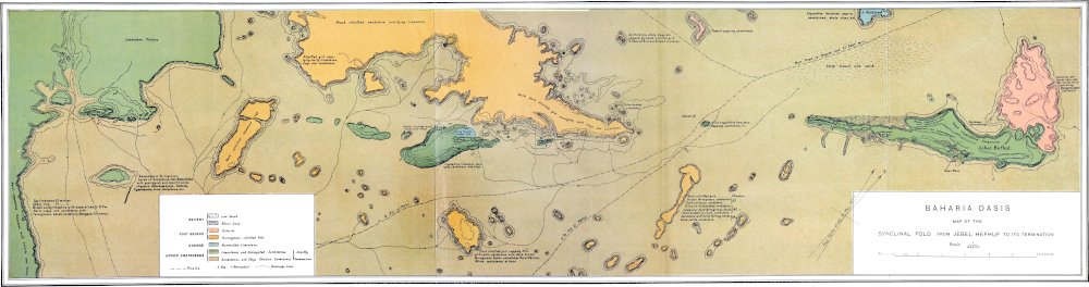 Formation of depression.As a result of the sharp folds the upper limestones were cracked, and their denudation by natural agencies followed, forming a slight hollow similar in shape to that which the oasis now exhibits; the agent of denudation cannot be stated with certainty, but whatever force came into operation it would find easy work in the cracked-up rocks, and still easier would be its task in partly removing the soft Cenomanian sandstones and clays after the harder limestones had disappeared. The primary excavation of the hollow was followed by the formation of a great lake, in which were laid down deposits of sandstone, quartzite, and iron-ore; this lake doubtless surrounded islands, represented to-day by those hills which still preserve their limestone-caps; it extended, or similar lakes existed, beyond the oasis-limits, forming the quartzites and ferruginous sandstones passed on the way from Maghagha to Baharia, and was perhaps continuous with the Oligocene and post-Oligocene sea which covered a large part of the country to the north.