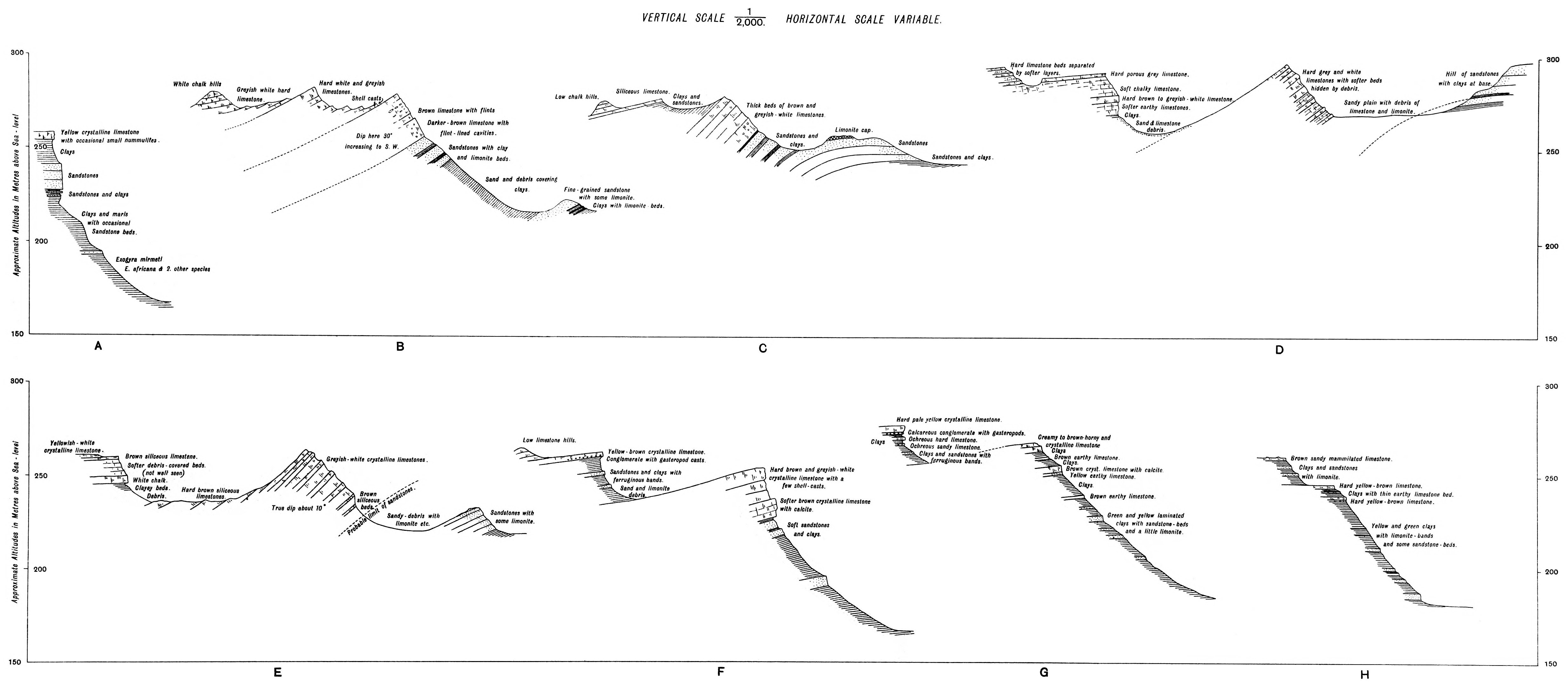 The first undoubted Eocene deposits in the Baharia area are the limestones with Operculina and Nummulites which unconformably overlie different members of the Cretaceous in the north and west sides, and eastward of the south end. The whole of the Eocene deposits are here, however, only a few metres thick, which contrasts strangely with the enormous thickness of the deposits of the same age in the Nile Valley. This is intelligible, however, on the supposition that near the subsiding Cretaceous land the conditions for continued accumulation of deposits were not so favourable as further to the east, where deeper water conditions obtained.