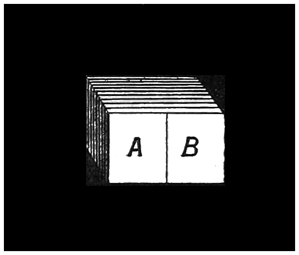 The colour of the bichromate is therefore a complex or mixed colour according to our definition, for it is made up of a large number of simple colours. What I desire to show, however, is that this complex colour can be mistaken by the eye for a simple colour. First, let us interpose the cell with the bichromate in the path23 of the reflected beam, and throw the patch of light formed by it on a white surface A (Fig. 6), alongside the patch of light B formed by the spectrum. Next let us pass a single aperture (Fig. 7), which can be opened and closed by a screw arrangement, through the spectrum. By careful movement we at length come to an orange ray, which is spread out by the apparatus to form a patch on B, that to the majority (and the word majority is used with intention) of people exactly matches the colour of the bichromate. Thus we have a proof that, as far as the eye is concerned, the simple and the complex colours are identical. This illustration of the want of power of the eye to analyse colour might be repeated as often as we like. We may pass coloured wools, for instance, through the length of the spectrum and show that they have the property of appearing bright in, and therefore of reflecting, some colours and of almost disappearing in others—a sure indication that these colours are mixed colours as they are made up of the rays which are reflected. Yet when viewed in white light they can in many cases be matched with simple24 colours in the way we matched the colour of the bichromate solution. This tells us that there is something which requires investigating as to the constitution of the perceiving apparatus, and points to the probability that it is less complicated than it would be were it able to differentiate, without the aid of the spectrum, between simple and complex colours. If the eye had a separate apparatus—and when I say apparatus I use the word for want of a better—for taking up the impression of every simple colour, it might well be assumed that a differentiation must take place.