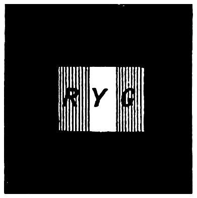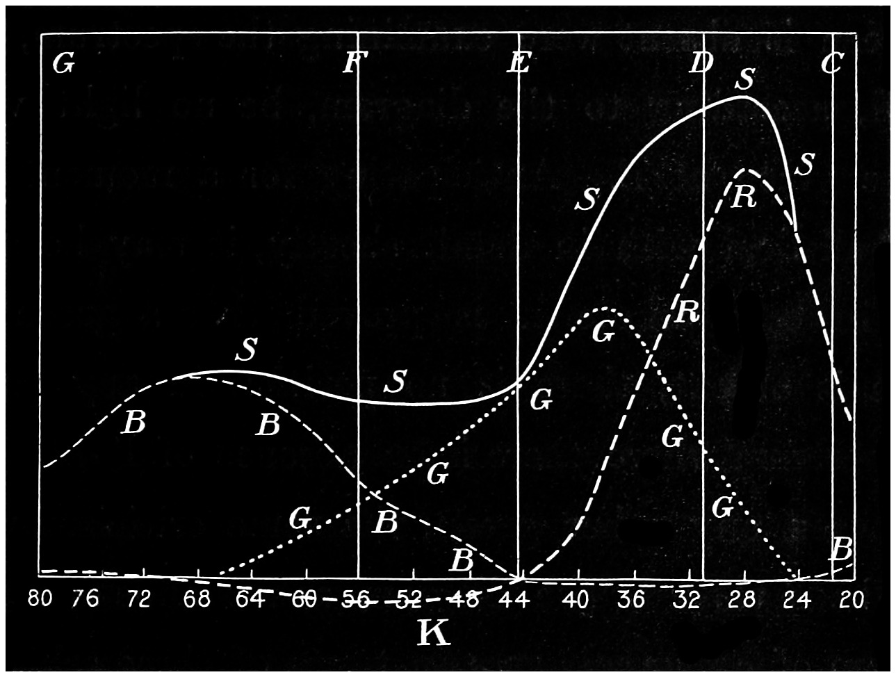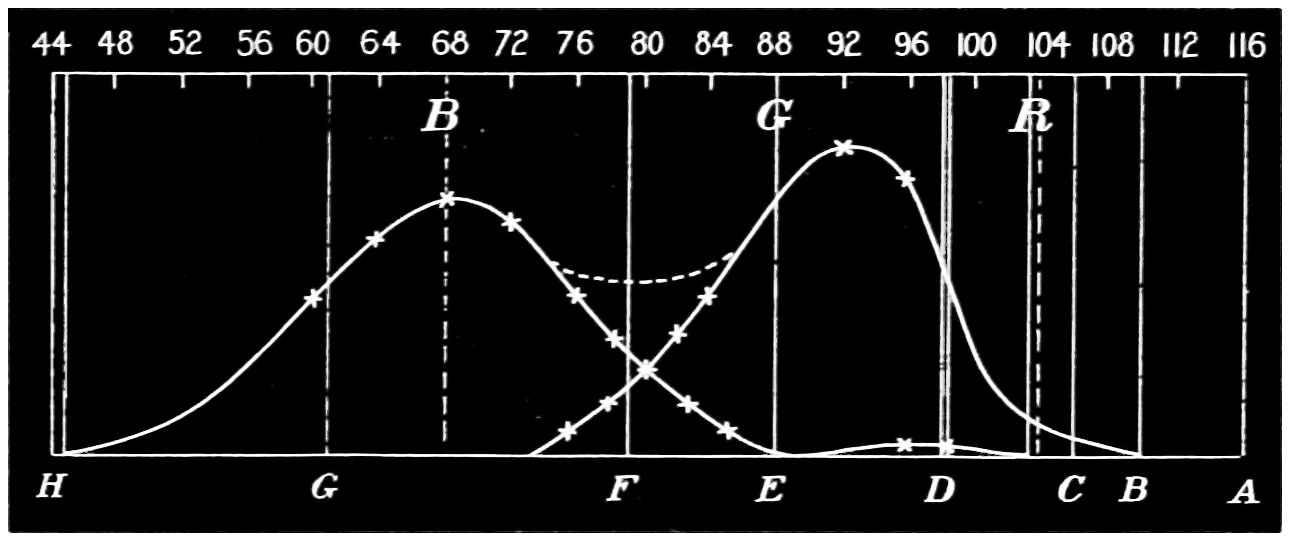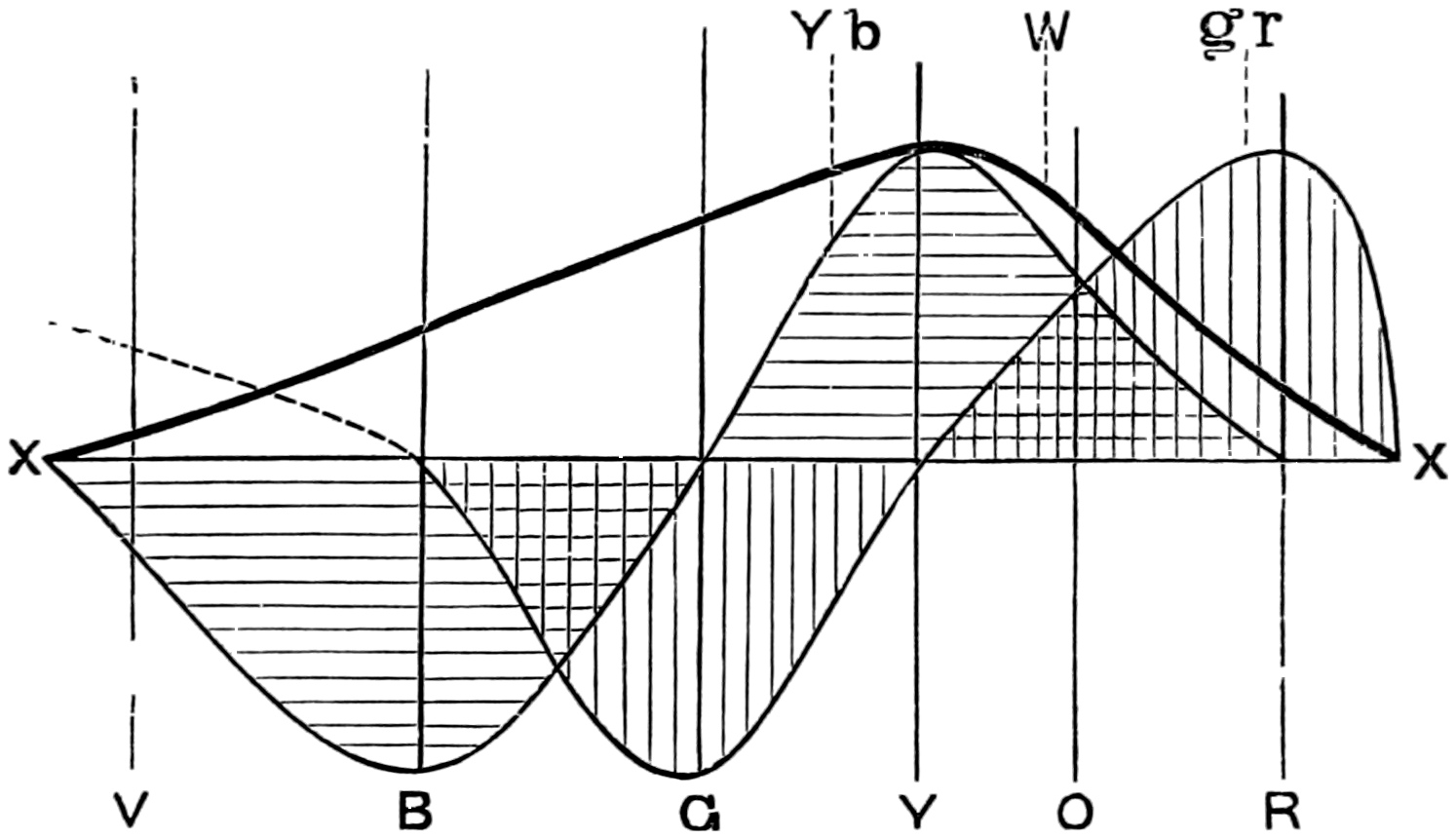 Now, placing one slit in the yellow and another in the blue of the spectrum, we find that whatever width of slit we take, no green is produced, but that, in fact, a yellowish or a bluish white results, and that when the two slits are properly adjusted, a pure white is produced. Evidently since none of the intermediate spectrum colours between the blue and the yellow can be made by their mixture, certainly green cannot. Hence, with pure colours a green and not a yellow is one of the primaries.