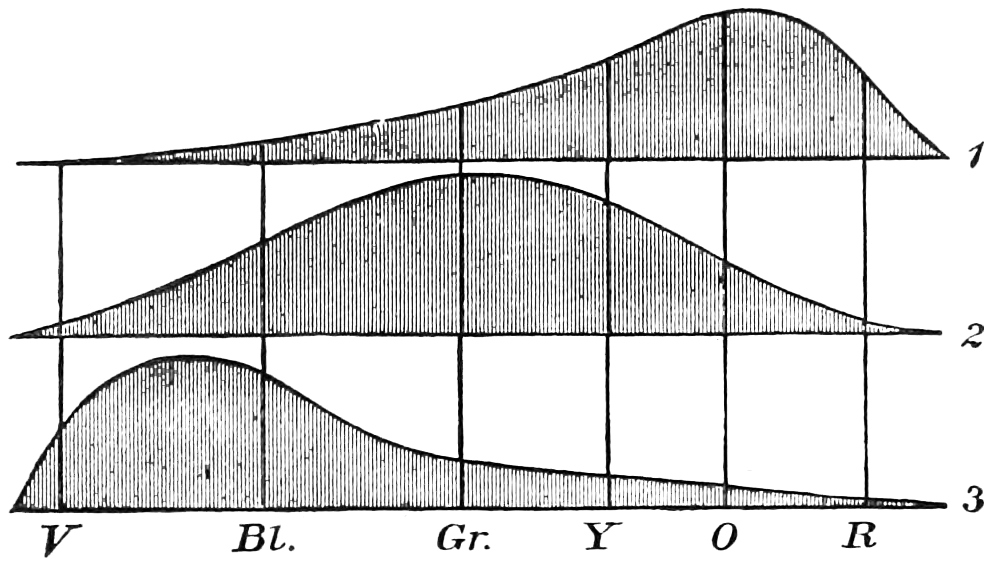 As the colour of this spot is yellow or brown in the living eye (and that it is probably brown the absorption indicates), it follows that white light passing through it must be deprived of some of its components, though in differing degrees. If the seat of sensation is at the outer layer of the retina, as we5 shall shortly see must be the case, it will further be seen that when light of any colour which the brown pigment will absorb more or less completely falls on different parts of the oval area, the absorption must vary at each part, and the intensity of the perceived light will be least at the rim and increase centrally and peripherally. As the centre of the yellow spot or fovea is coincident approximately with the point where the axis of the eye cuts the retina, the image of an evenly illuminated object, when looked at directly, must fall on the yellow spot. If, therefore, a patch of such light, the image of which more than covers the spot, be observed, it ought to exhibit a varying brightness of colour corresponding to the strength of the colouring matter which exists at the different parts. This it but rarely does, for habit and constant interpretation of what should be seen prevents the mind from distinguishing these variations; but if the colour brightness, as perceived by the different parts, be submitted to measurement by proper means, the variations in brightness of the image can be readily recognised. A very common method of exhibiting the presence of the pigment is to look at a bright white cloud through a layer of chrome alum. Chrome alum transmits red and blue-green rays. Now as6 the spectrum-blue rays are those which the pigment will absorb, it follows that the colour of the solution should appear ruddy to the central part of the eye, but on the rest of the retina it should appear of its ordinary purplish colour. At a first glance, and before the eye has become fatigued, this is the case, but the phenomenon soon disappears. Another way of forming an idea as to what the yellow spot absorbs is to throw a feeble spectrum on a white surface and cause the eye to travel along it. If the spectrum be viewed so that it does not occupy more than about 40° of the retina, the movement of the eye will show a dark band travelling along the green, blue, and violet regions as the image of these parts of the spectrum fall on the yellow spot, and their apparent brightness will increase as they fall outside the absorbing area. This proves that an absorption takes place in this area.