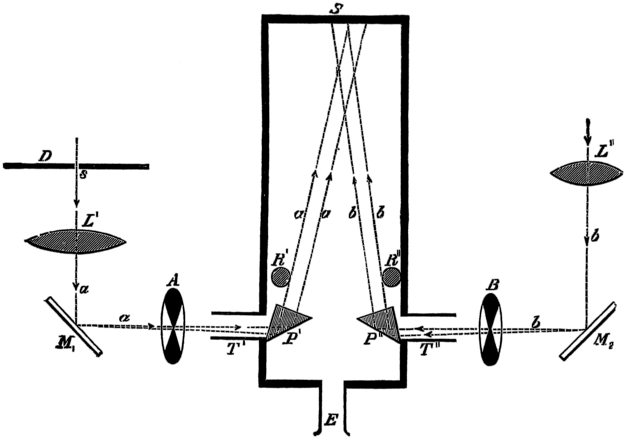 If it be required to measure the width of the slits S₂ (which we shall see further on is often necessary), a small lens of short focal length placed behind L₄ and near the slit will cast a magnified image on E, and by means of a scale placed there, the widths of each slit, if there are more than one, can be read off on the21 scale by bringing them successively into the same colour.