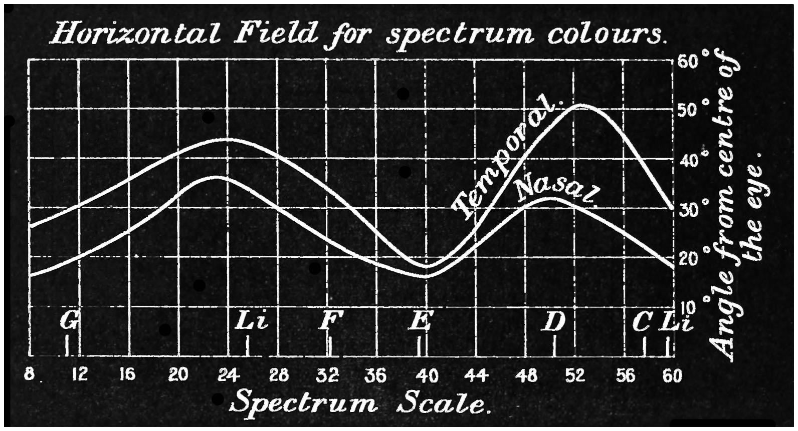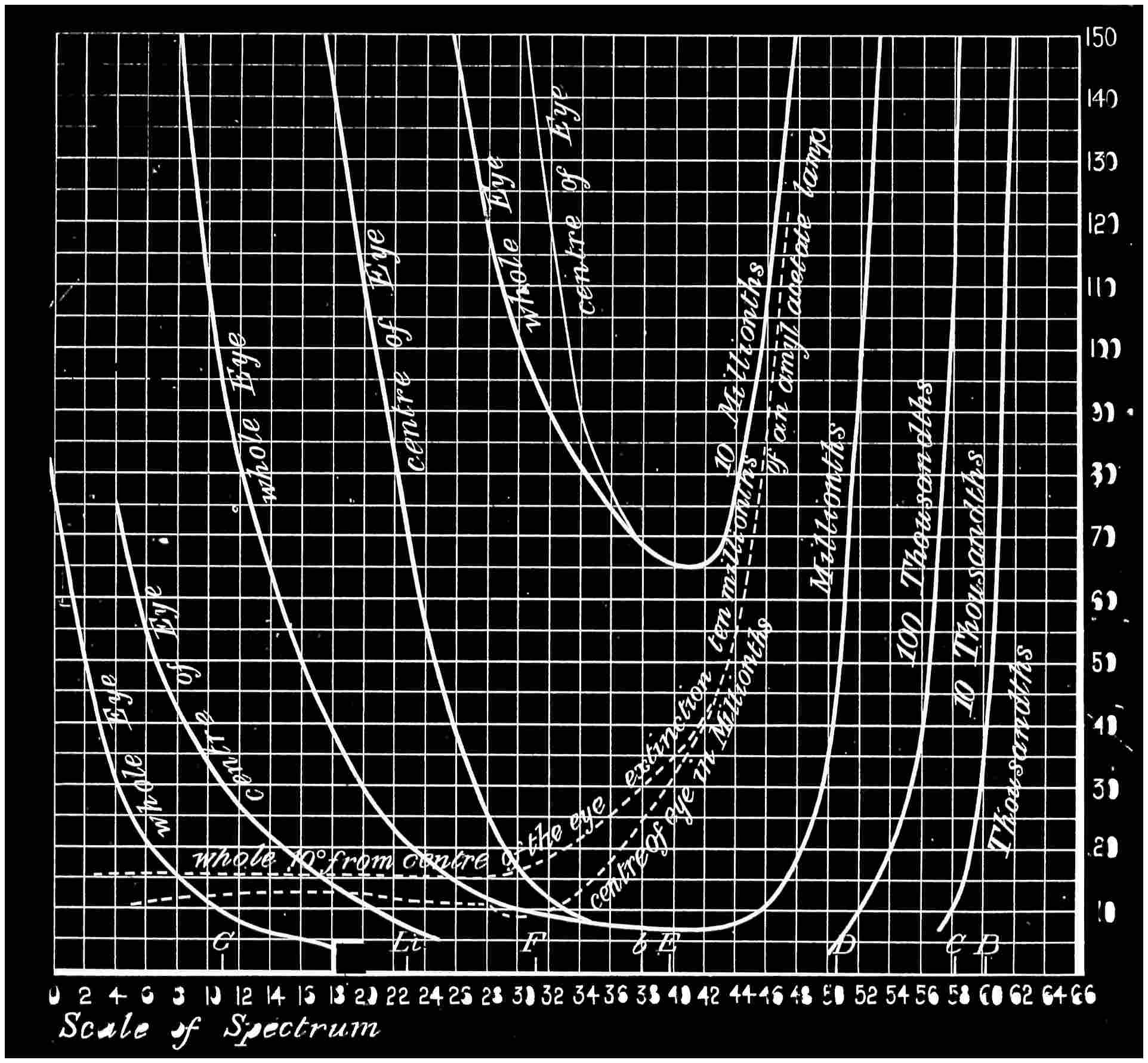As far as the perception of colour is concerned, the principal part of the eye which is not distinctly optical—i.e. for the production of images—is the retina, and this it will be seen is in reality an outcrop of the brain, the connection between the two being the optic nerve. Owing to this connection, it is not easy to determine where the seat of colour perception is located; but for the purpose of physical investigation this is not of first-rate importance, nor does it affect the discussion of rival theories except in a minor degree. There are other subsidiary adjuncts in the eye to which, however, I must call attention, as they have a distinct bearing on the apparent intensity4 of some colours and of the hue that mixtures of others are perceived. The first is what is called the “macula lutea,” or yellow spot, a spot which it may be assumed exists in every eye. It is horizontally oval in form, and is situated in the very centre of the retina, embracing some 6° to 8° in angular measure. It has a brownish or yellowish tint, and the retina at this part is slightly depressed, being bounded by a slightly raised rim. In the centre of this area the retina becomes very thin, having a depression about 1/100 of an inch or ·3 millimetres in diameter, which is named the “fovea centralis,” where it is said that vision is the most acute. This statement can be well credited when we come to consider where the seat of the stimulation of sensation lies. The colour which tints the yellow spot is strongest at the crater-like rim, and fades away centrally and peripherally, and is said to be wholly absent in the fovea centralis.