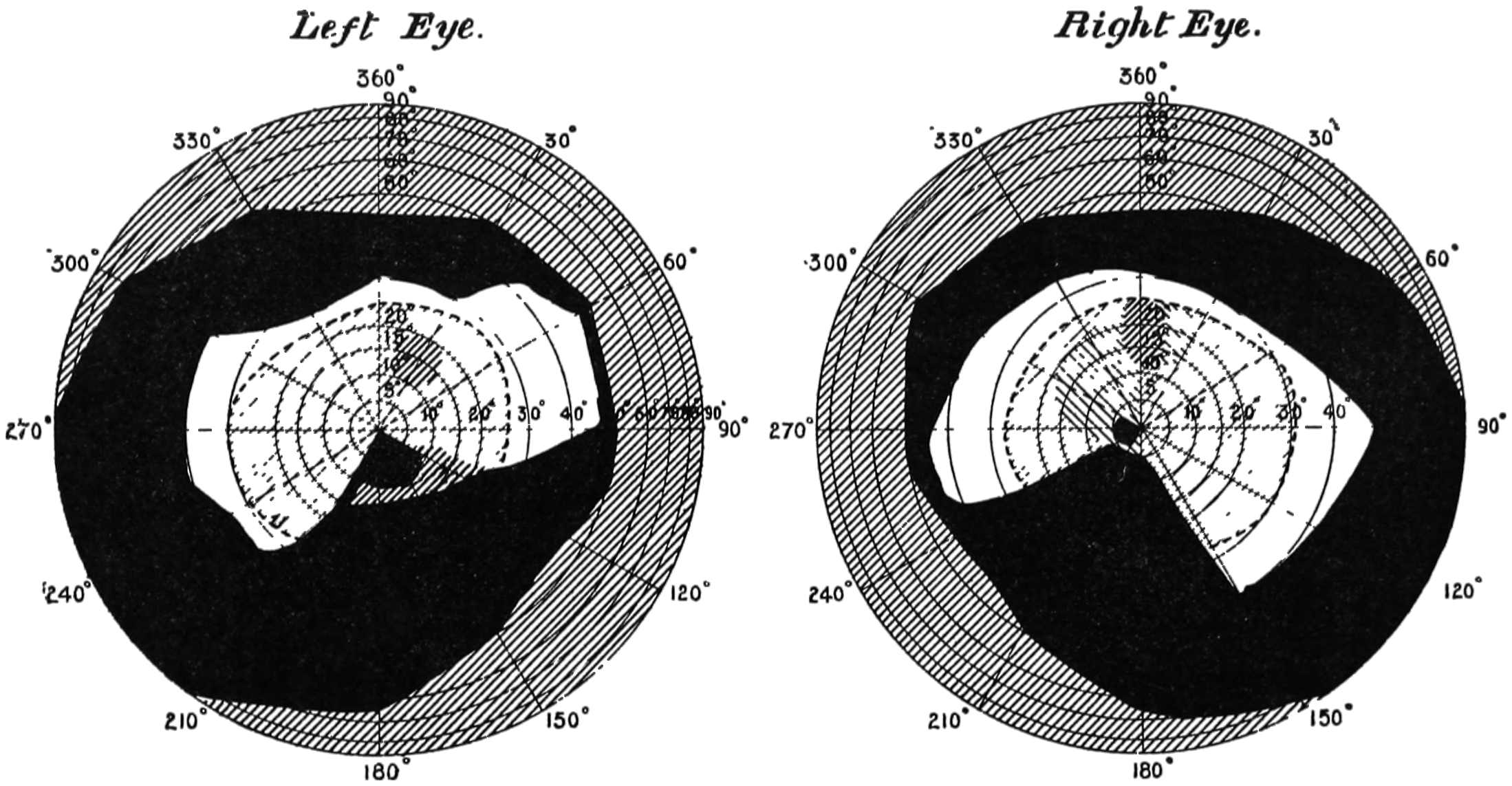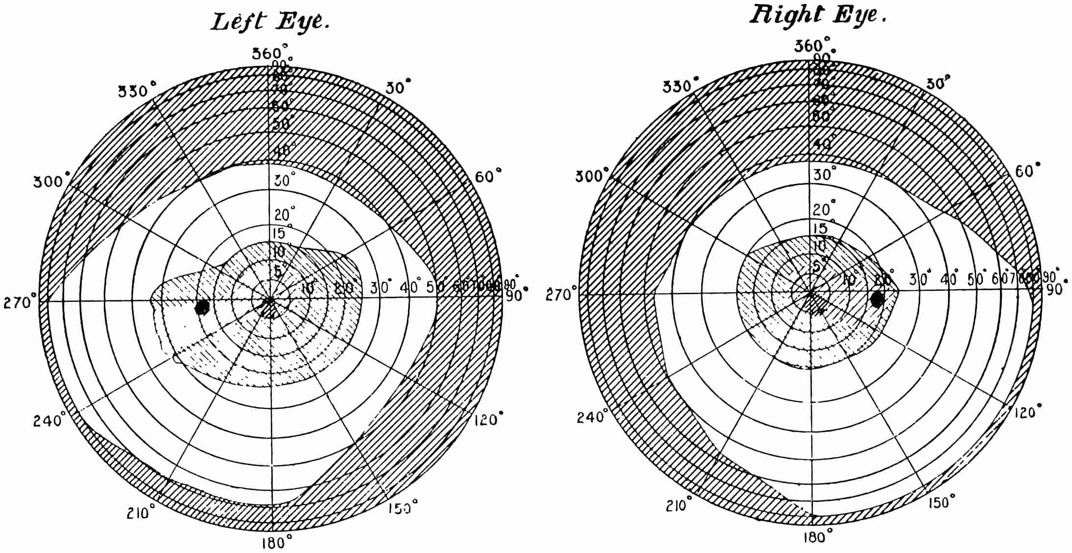 Many persons are not aware of the extent of the field of view which the eye embraces. Vertically it takes in about 100°, whilst horizontally it will take in some 145°, more or less. The field is smaller on the nasal than on the temporal side. When both eyes are used, the combined field of view is larger horizontally, being about 180°. The field of view which is common to both eyes is roughly a circle of about 90°. There11 is, however, a marked difference in the distinctness with which objects are perceived in the different parts of field of view. On the fovea centralis two dots placed so as to subtend an angle of 60″ will be perceived as double. That is to say, if a piece of paper, on which are two dots 1/30 of an inch apart, be placed 10 feet away from the observer, these dots will be seen as separated, whilst dots (in this case they should be black and of good dimensions) placed half-an-inch apart would still appear as one if viewed at the same distance near the periphery of the retina. In the yellow spot the distance apart of the cones is such that they subtend about the same angle as the dots when they are seen separate, viz., about 60″; that is, they are about 16/100000 of an inch apart, and hence may have something to say to the limit of separation. The field for the perception of colour is different to that for light.